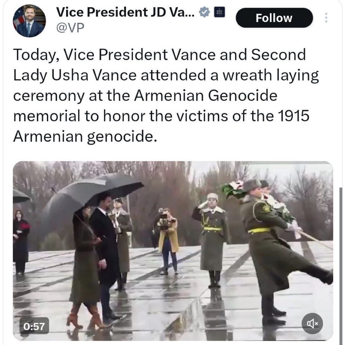 В ходе своего визита в Армению Джей Ди Вэнс посетил мемориал жертв геноцида армян в Османской империи. В твиттере Вэнса появился пост со словом "геноцид".