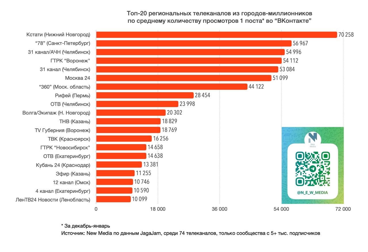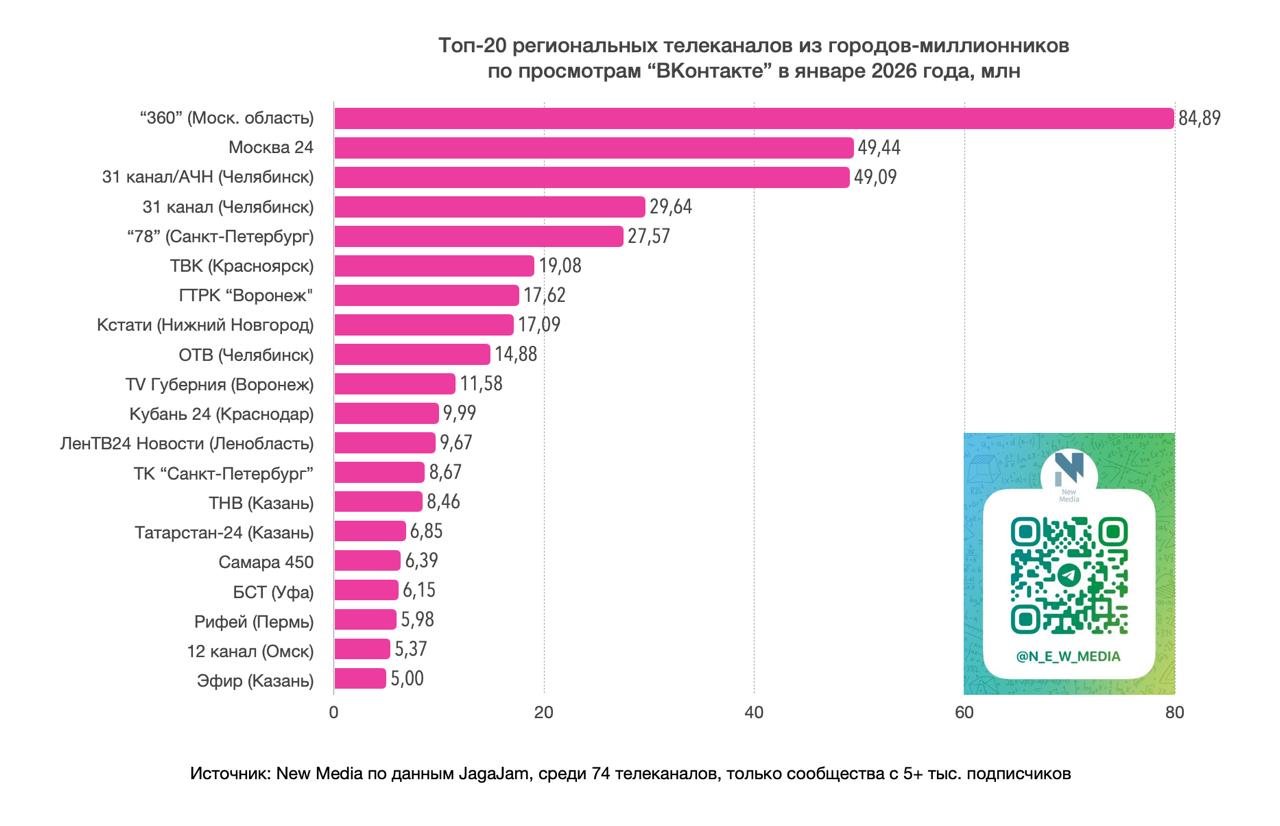 Топ-20 региональных телеканалов "ВКонтакте" в январе 2026 года
