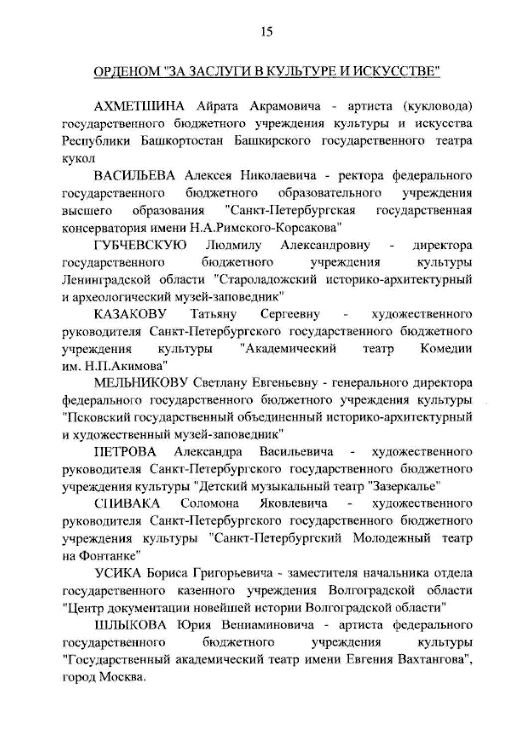 Президент России Владимир Путин в среду, 11 февраля, подписал указ о награждении ряда граждан государственными наградами. В числе отмеченных - директор Староладожского музея-заповедника Людмила Губчевская. Ее наградили Орденом за заслуги в культуре и искусстве.