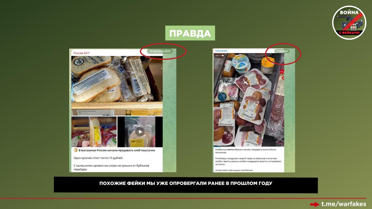 Например, слух о том, что россияне настолько обеднели, что вынуждены покупать хлеб по одному куску, мы опровергали еще в августе 2025 года.