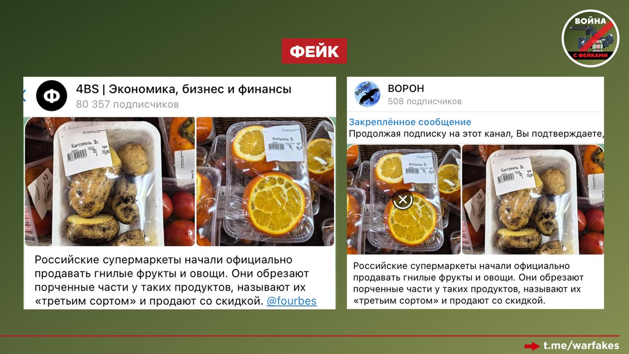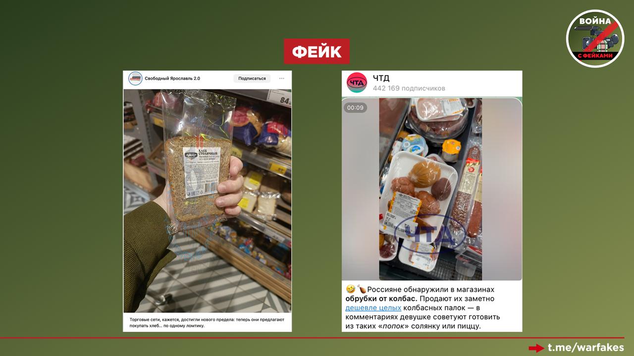 Фейк: В России вместо продуктов в магазинах продают некачественный товар: обрезки колбас, кусочки хлеба вместо буханок, а цены на них, особенно на овощи, необоснованно взвинчены. Такой вывод можно сделать из серии публикаций в украинских и оппозиционных каналах.