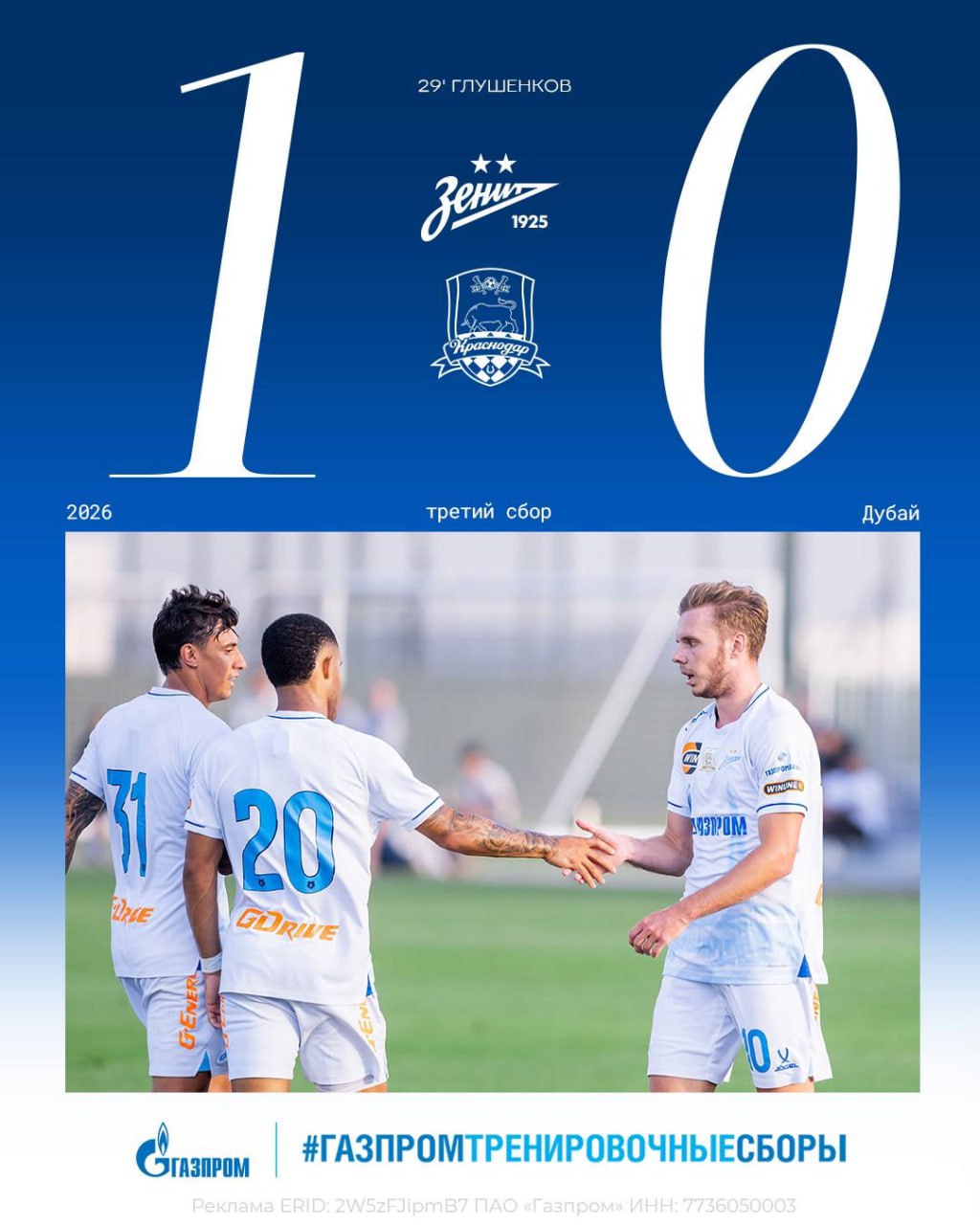 «Зенит» одолел «Краснодар» на сборах в Дубае. Встреча завершилась со счетом 1:0 в пользу сине-бело-голубых. Единственный гол в игре забил Максим Глушенков.