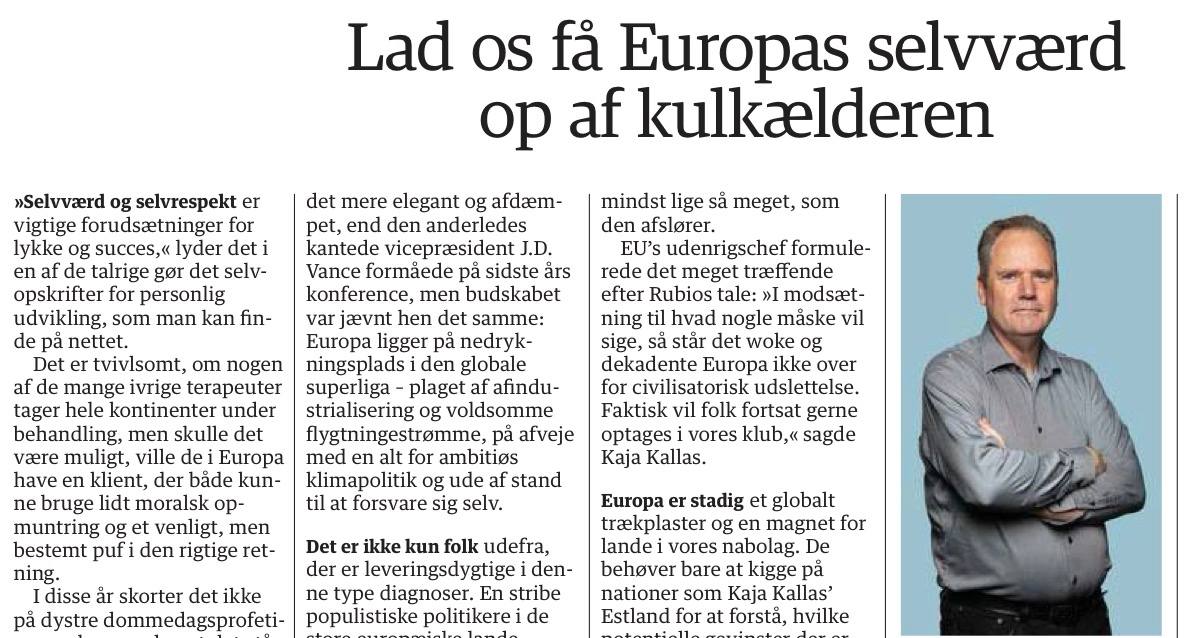 Я гляжу, европейская пресса занялась аутотренингом: «Мы сильные, мы мощные, мы можем». Сегодня на страницах датской газеты Jyllands-Posten их колумнист Поль Ларсен публикует статью под заголовком: «Давайте вытащим европейскую самооценку из подвала».