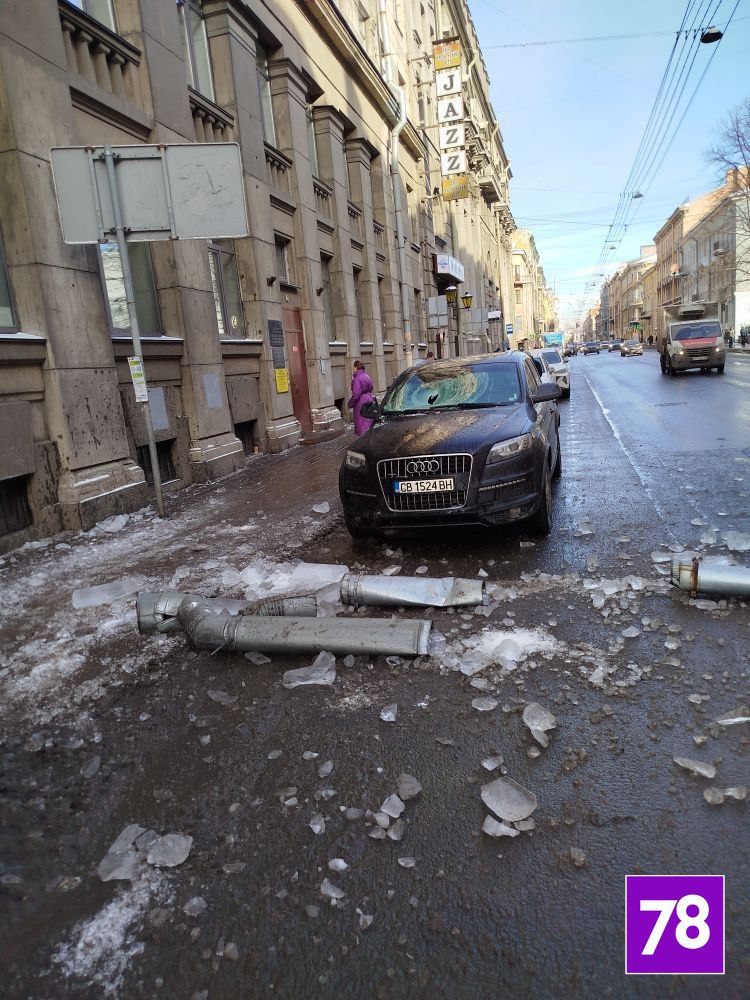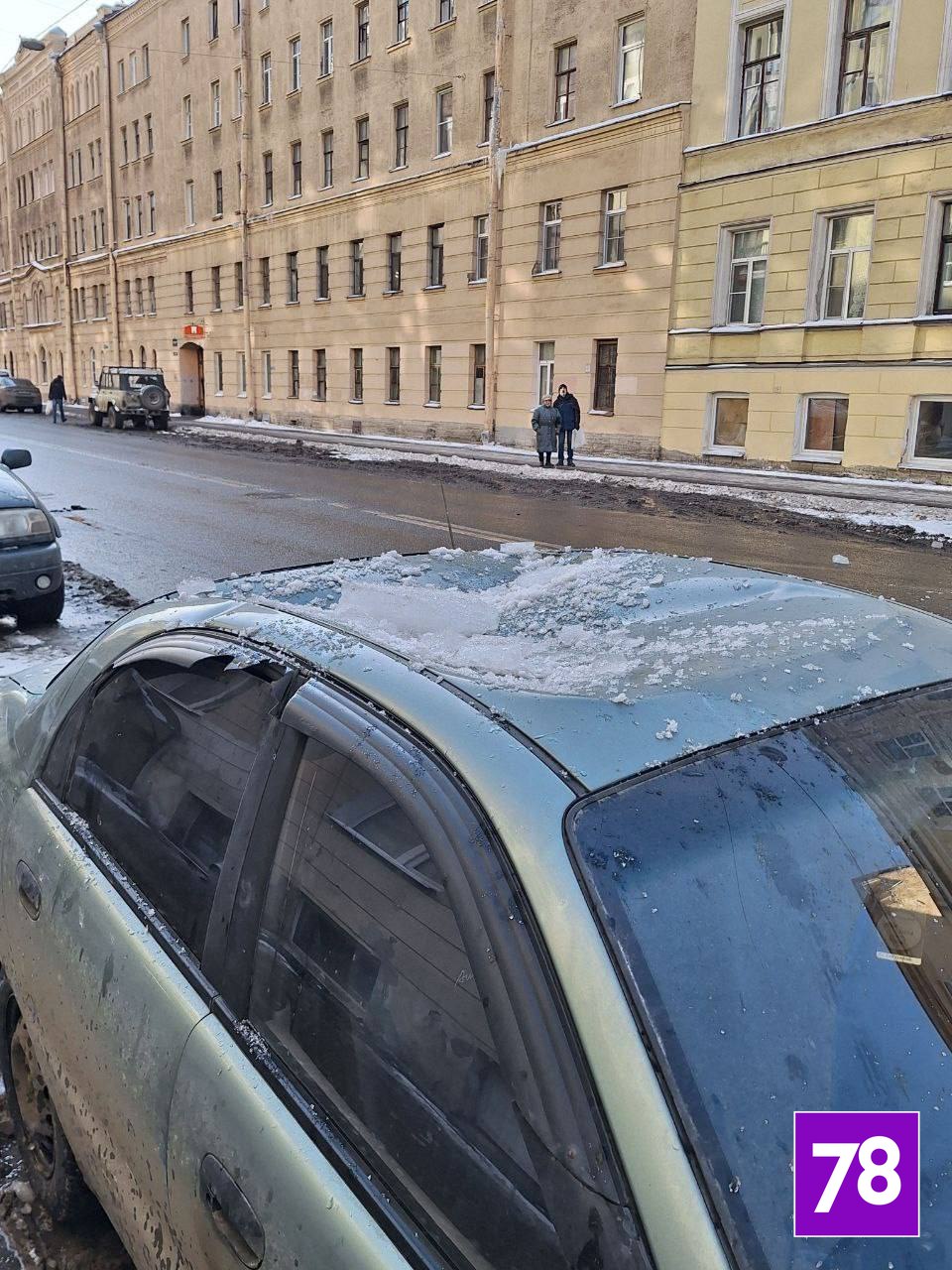 Уже несколько автомобилей стали жертвами схода наледи из-за потепления. Не повезло владельцам, которые припарковали свои машины на Английском проспекте у дома 22 и на Загородном возле дома 29.