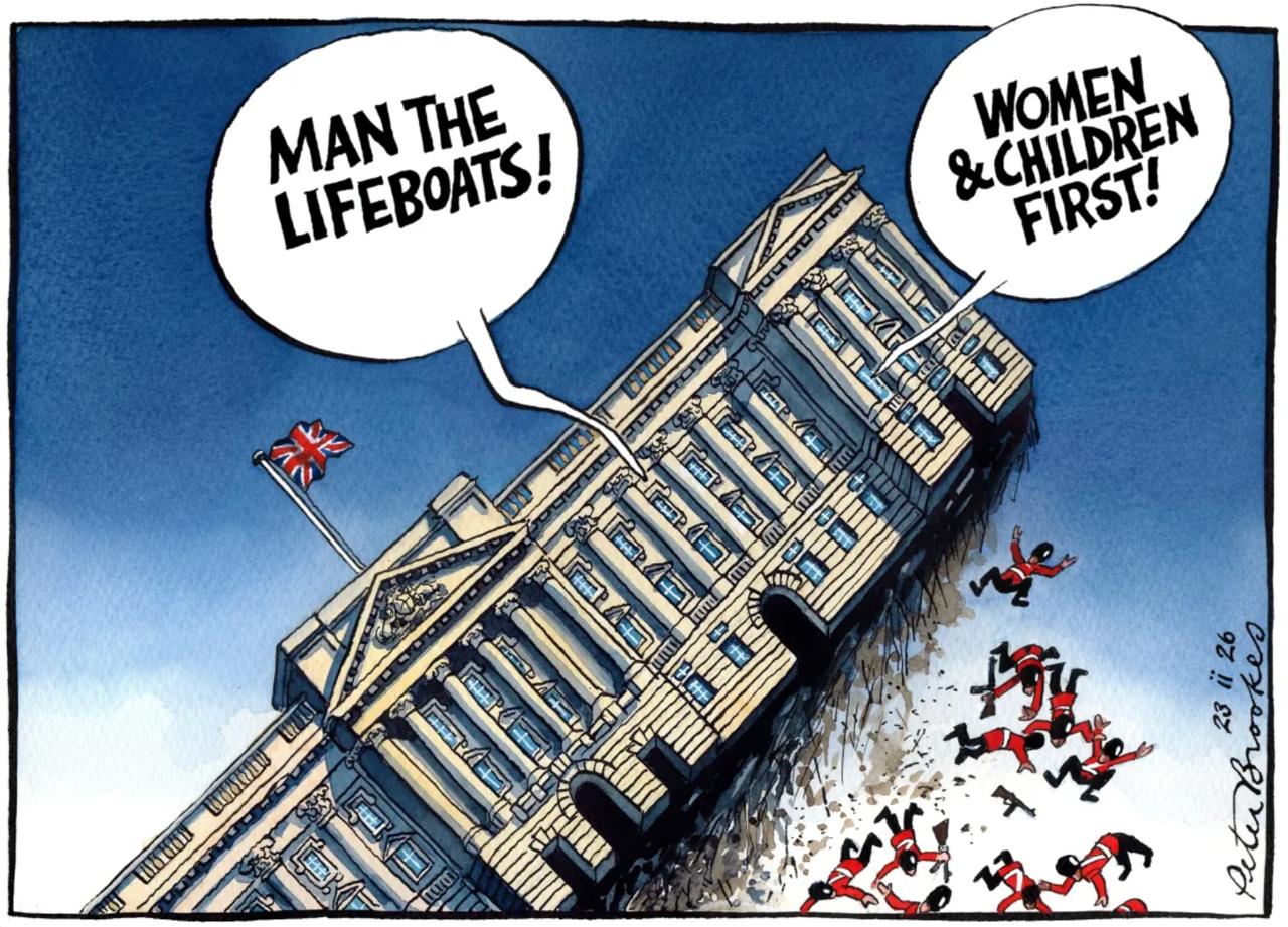 В продолжение затронутой сегодня темы The Times наглядно иллюстрирует, как королевский дворец в Британии стремительно уходит под воду под тяжестью скандала вокруг извращенного принца Эндрю, потянувшего за собой всю прогнившую королевскую семейку.