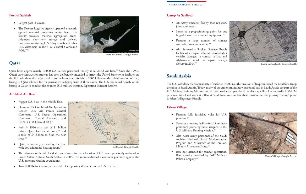 · Авиабаза Аль-Удейд — крупнейшая американская база в регионе, передовой штаб Центрального командования ВС США (CENTCOM).