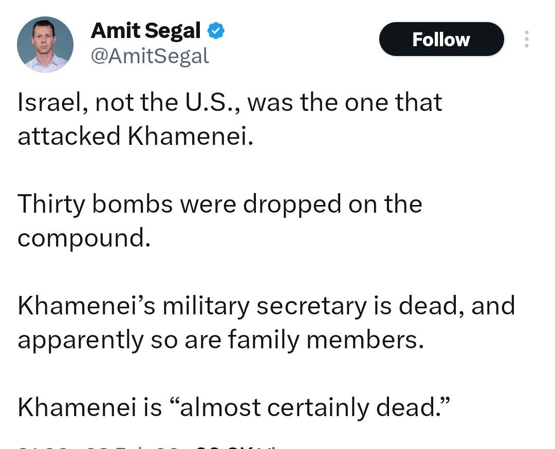 На резиденцию правителя Ирана сегодня было сброшено 30 бомб. По информации Сегаля, убит секретарь Хаменеи и несколько членов его семьи. Самого Хаменеи Израиль считает "наверняка убитым".