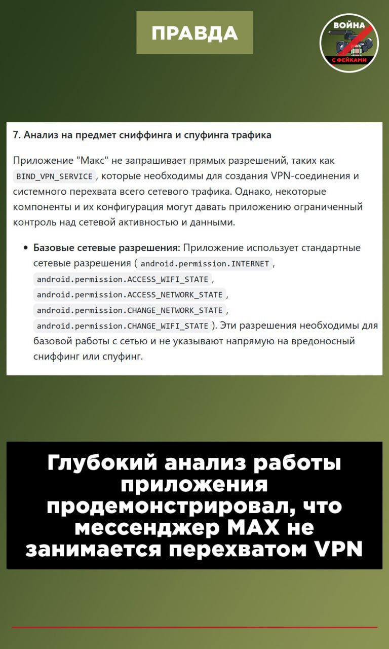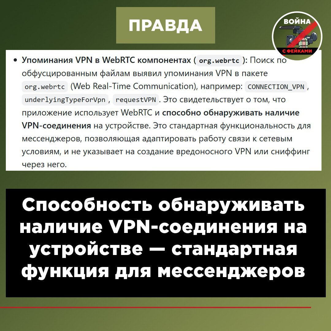 Приложение использует WebRTC и способно обнаруживать наличие VPN-соединения на устройстве. Это стандартная функциональность для мессенджеров, позволяющая адаптировать работу связи к сетевым условиям, и не указывает на создание вредоносного VPN или сниффинг через него. – гласит вывод.