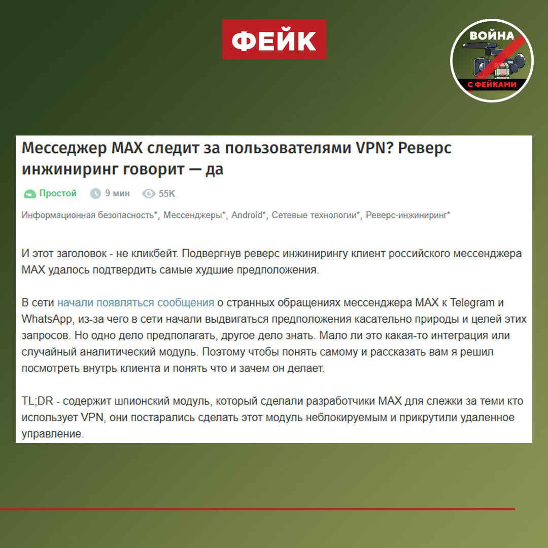 Фейк: Мессенджер МАХ следит за пользователями VPN сервисов. Статья такого содержания появилась на ресурсе Хабр и распространяется по телеграм-каналам.