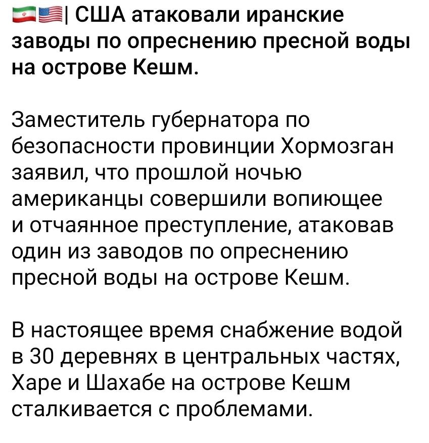 Судя по заявлению иранской стороны, вне зависимости от того били на самом деле США по опреснительной установке в Иране или нет, Тегеран готовит оправдание для ударов по опреснительным установкам стран Залива. Что очень усугубит ситуацию в них, переходя в гуманитарную катастрофу.