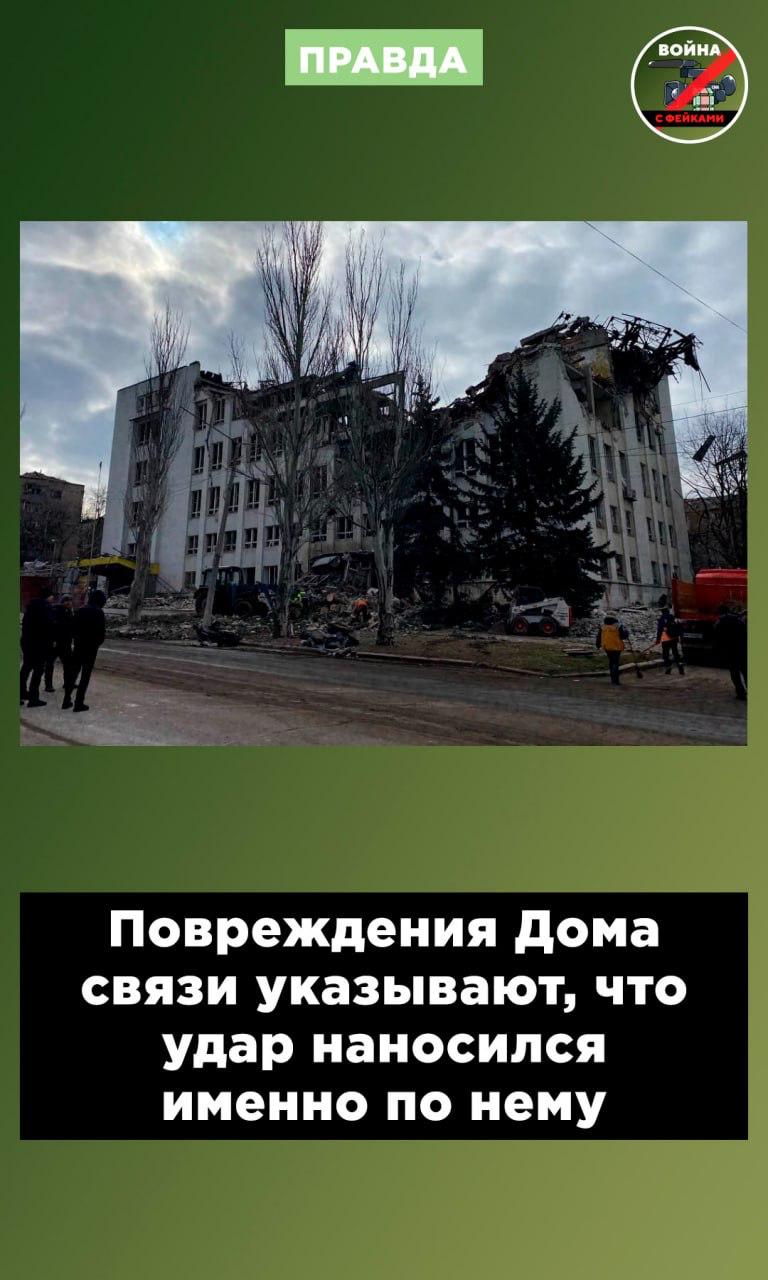 Правда: Удар был точечно нанесен по зданию Дома связи. Повреждения зданий вокруг характерны для воздействия ударной волны, а не прямых попаданий.