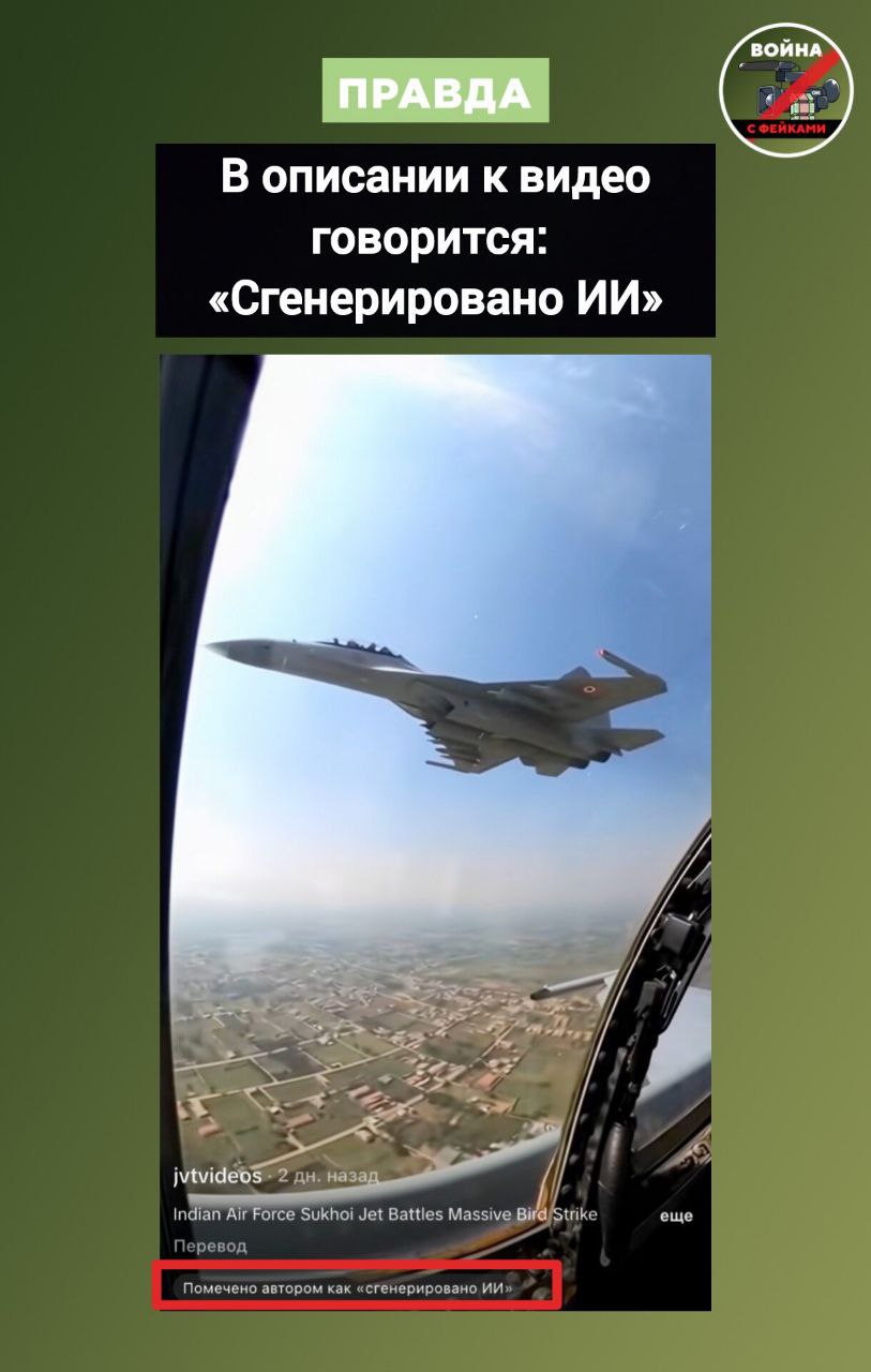 Правда: Перед нами очередной ролик, сгенерированный нейросетями. Первоисточником выступил аккаунт с ником Jvtvideos «ТикТоке». В описании к видео говорится: «Реактивный самолет Sukhoi ВВС Индии борется с массированным налетом птиц». Также присутствует пометка «сгенерировано ИИ».