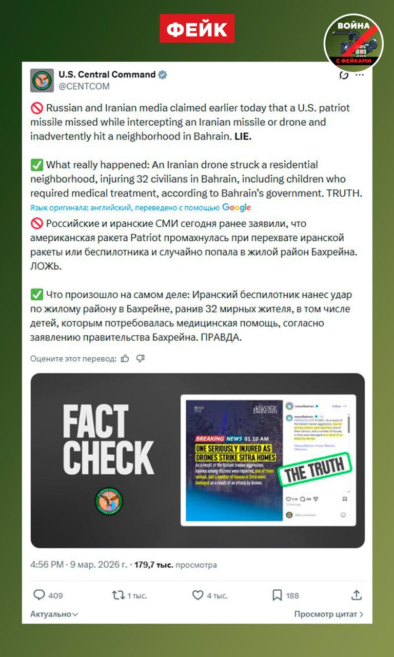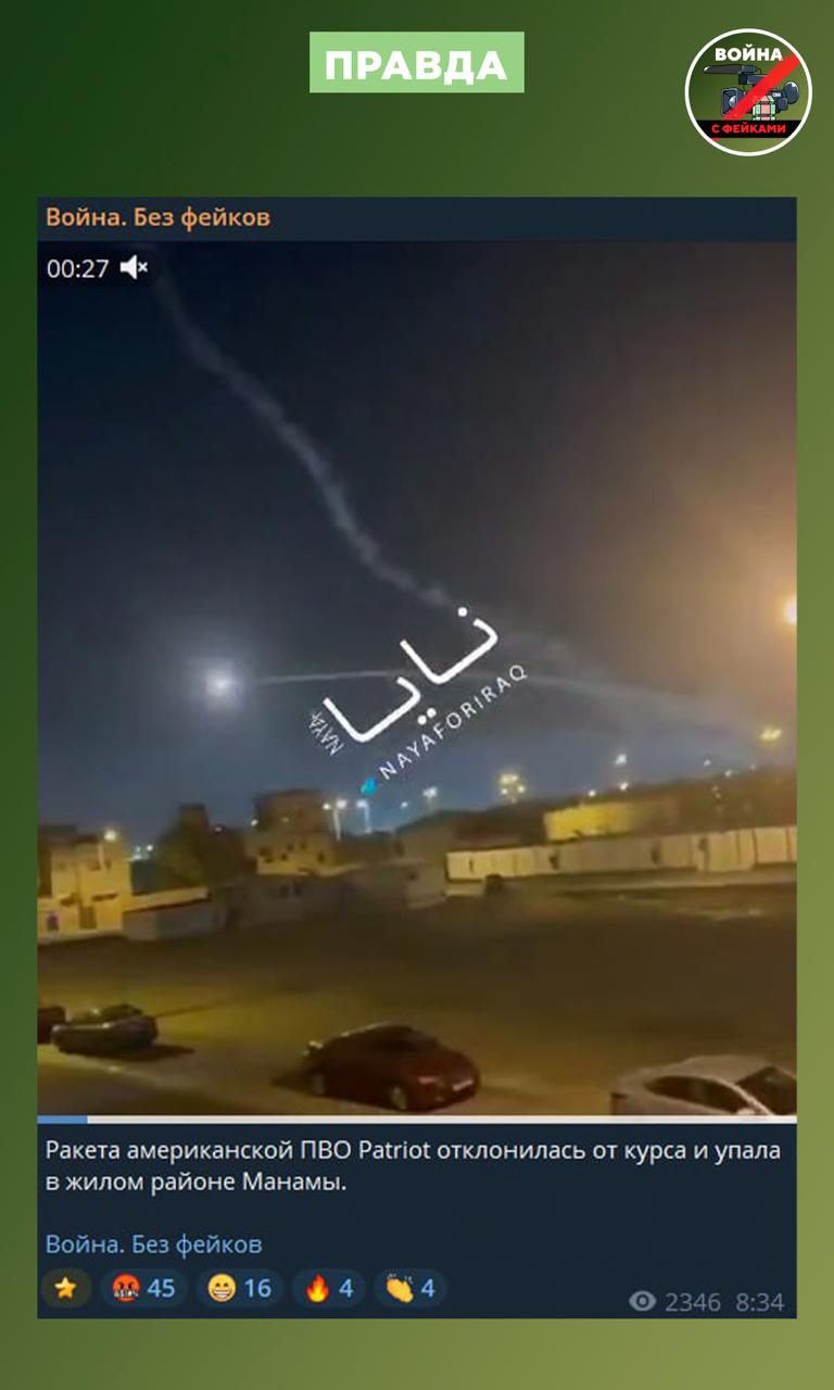 Фейк: Вопреки заявлениям ряда СМИ, жилой район в столице Бахрейна поразила не ракета Patriot, а иранский БПЛА. Об этом заявляет центральное командование США.
