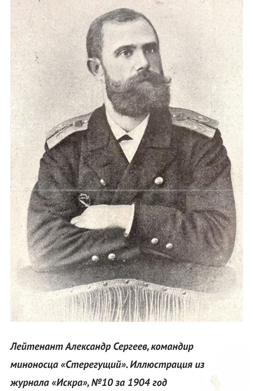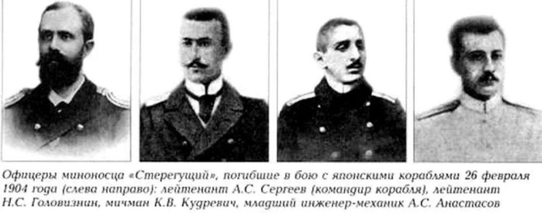 Ещё в начале боя Андреевский флаг прибили к мачте гвоздями, чтобы его не сорвало взрывом. Командир корабля лейтенант Сергеев руководил действиями команды, лежа на палубе с перебитыми ногами. Когда он погиб, командование принял лейтенант Н.С. Головизнин, но и он вскоре был сражён осколком. Моряки не только вели бой, но и боролись за плавучесть получившего множество пробоин миноносца. Укрыться на палубе «Стерегущего» было негде. По свидетельству уцелевших, дольше всех из носовой пушки вёл огонь получивший несколько ранений мичман К.В. Кудревич. Кочегары и машинисты подносили снаряды и тушили пламя. К концу боя кораблём командовал тяжело раненый инженер-механик В.С. Анастасов. Орудия «Стерегущего» замолкали одно за другим. Когда замолчало последнее, умирающий сигнальщик В.Я. Кружков с помощью легко раненого кочегара А.А. Осинина смог выбросить за борт секретные документы, утяжелив их привязанным грузом.