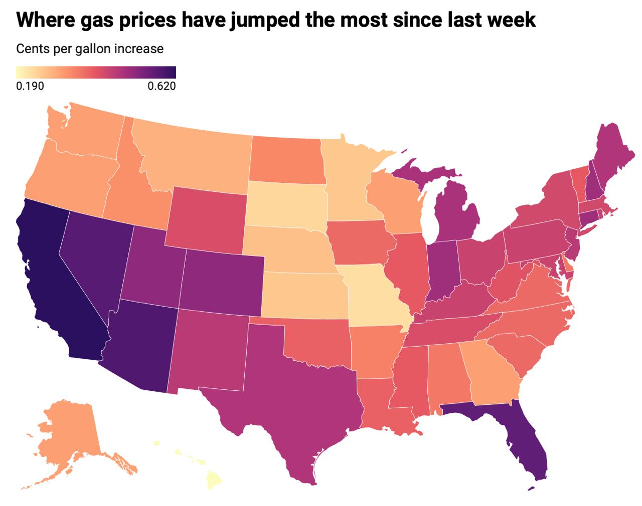 Выше всего цены на топливо традиционно в Калифорнии. Однако под ударом оказались и многие колеблющиеся штаты - Невада, Аризона, Мичиган, Мэн. В республиканской Флориде топливный кризис тоже проявляется - штат импортирует очень много бензина из Европы и Азии, а там сейчас всё грустно.