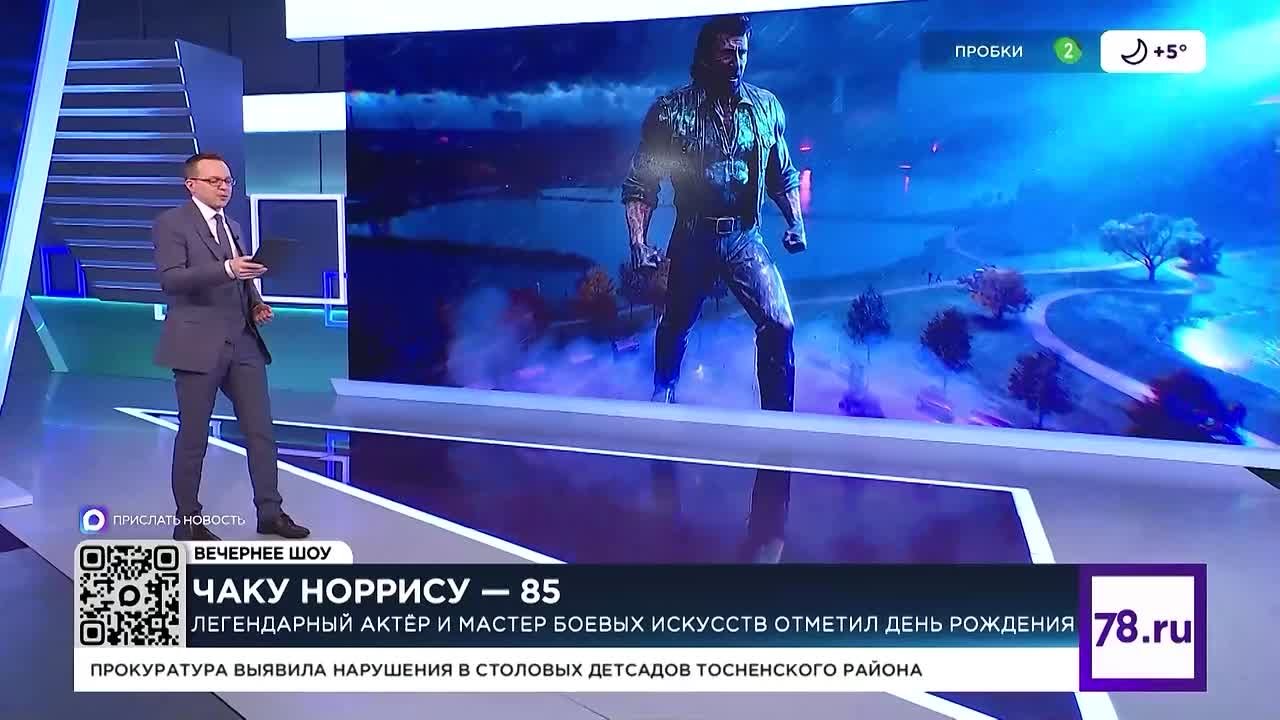 Звезде боевиков исполнилось 85 лет. Ведущий программы Роман Кирюхин напомнил, что Норриса с Москвой и городом на Неве связывают не только «кино-дела», но и спортивные состязания. Сам актер рассказывал, что, неоднократно приезжал в две столицы, чтобы «получать пояса».