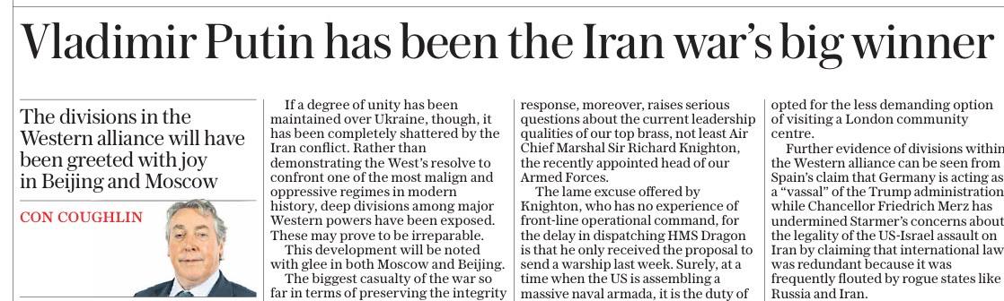 Он уже забыл, что всего-то пару месяцев назад активно призывал США напасть на Иран, и теперь рассказывает о том, как война в Иране расколола западный альянс, чем обязательно воспользуются Россия и Китай. Причем в статье нет ни одной ссылки на заявления россиян или китайцев. Все сводится к тому, что им это все должно очень нравится. Все сводится к одному выводу: