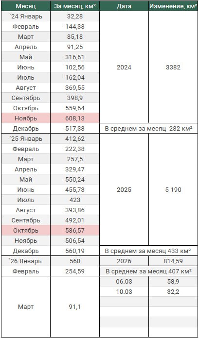 Обновление по данным c 06 по 09 марта 2026. Темп продвижения +8,0 км в сутки за период, общее продвижение 32,2 км.
