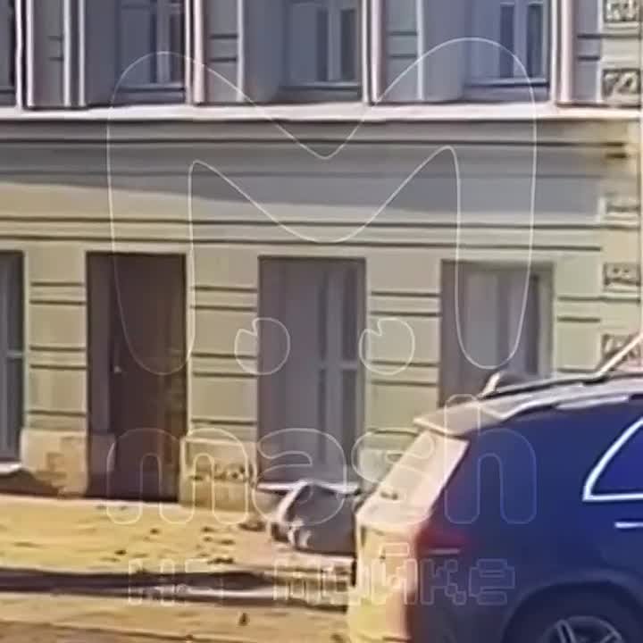 На кадрах видно, как на голову мужчины приземляется громадная часть фасада. Встать после этого он не может.