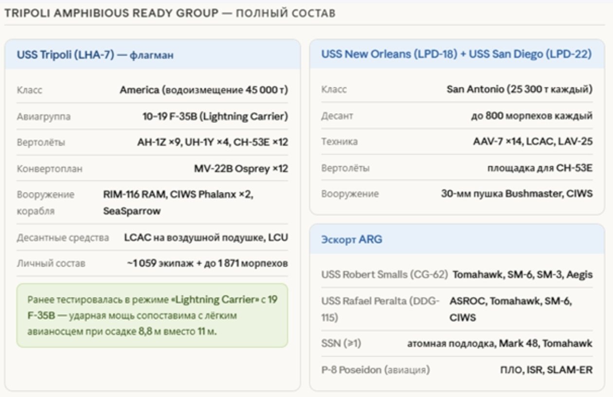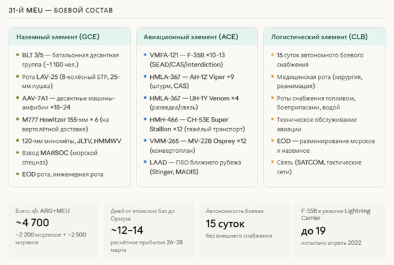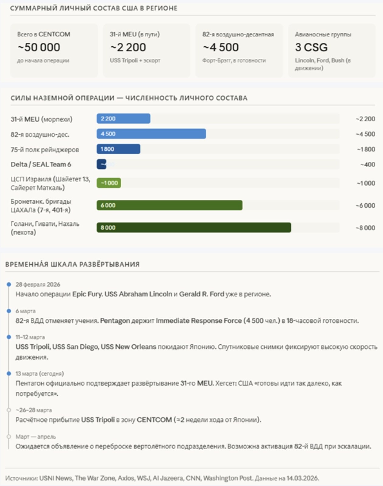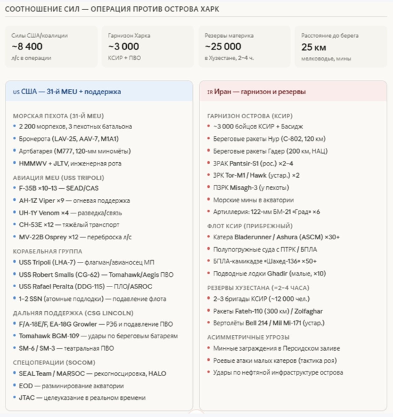 На инфографике: суммарный личный состав США в регионе, временная шкала развертывания, вероятности сценариев наземной операции, временное окно вероятностей, соотношение сил — операция против острова Харк, составы АДГ Tripoli и 31-го EMU, структура системы обороны Ирана, сравнение сил и риски.