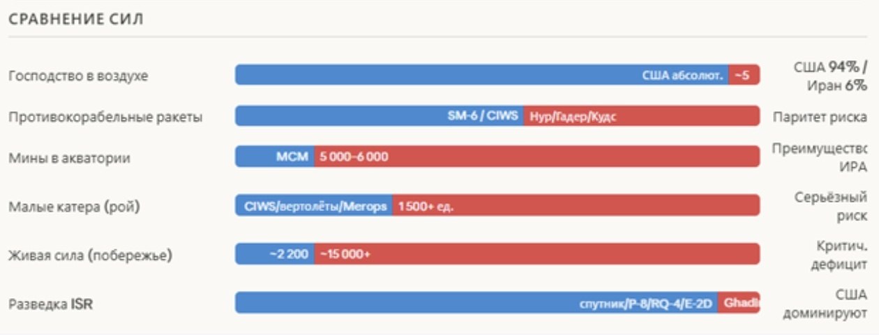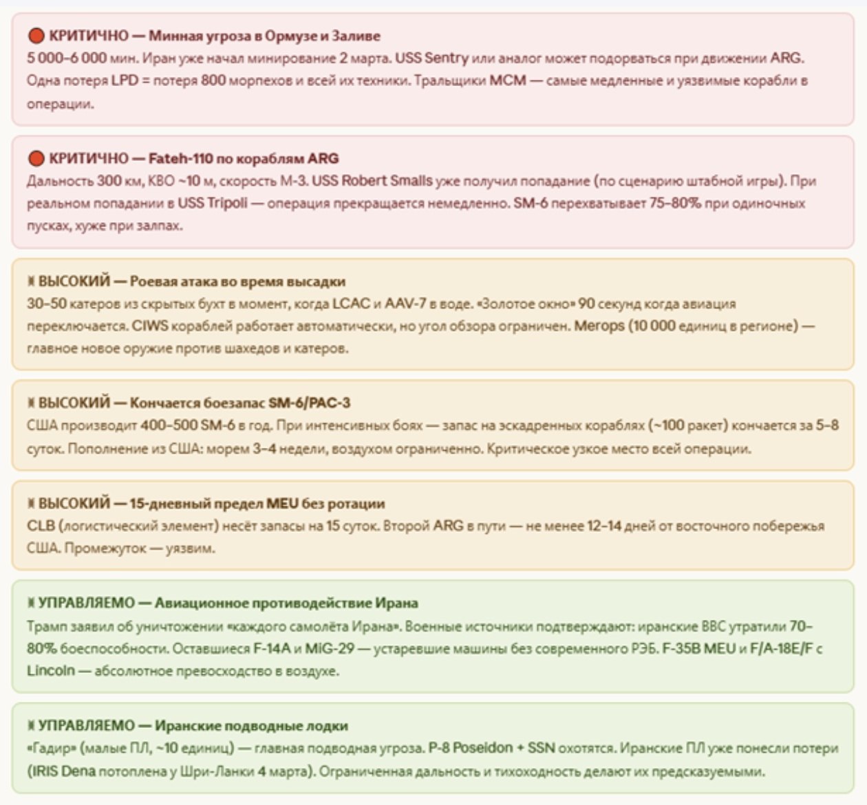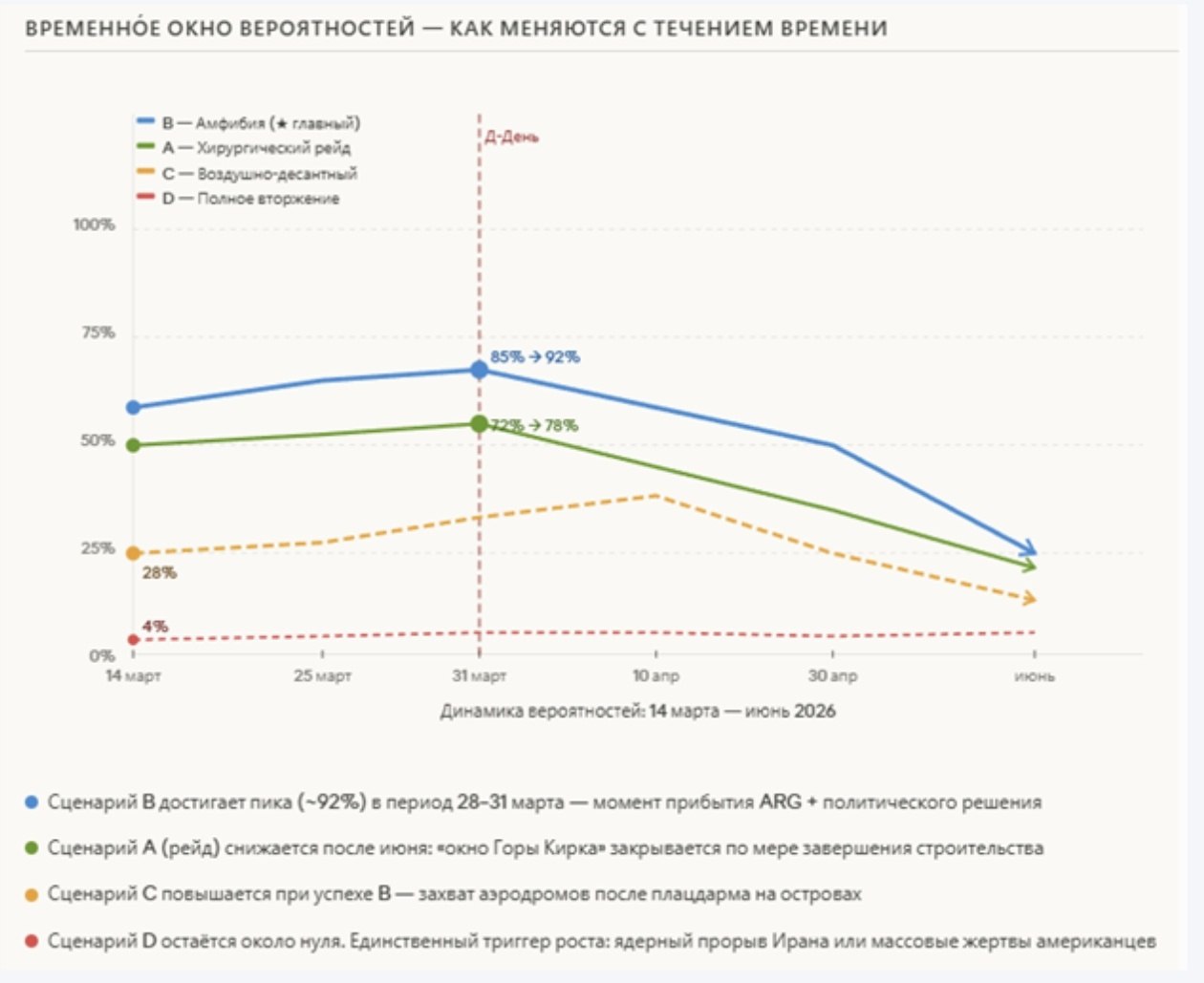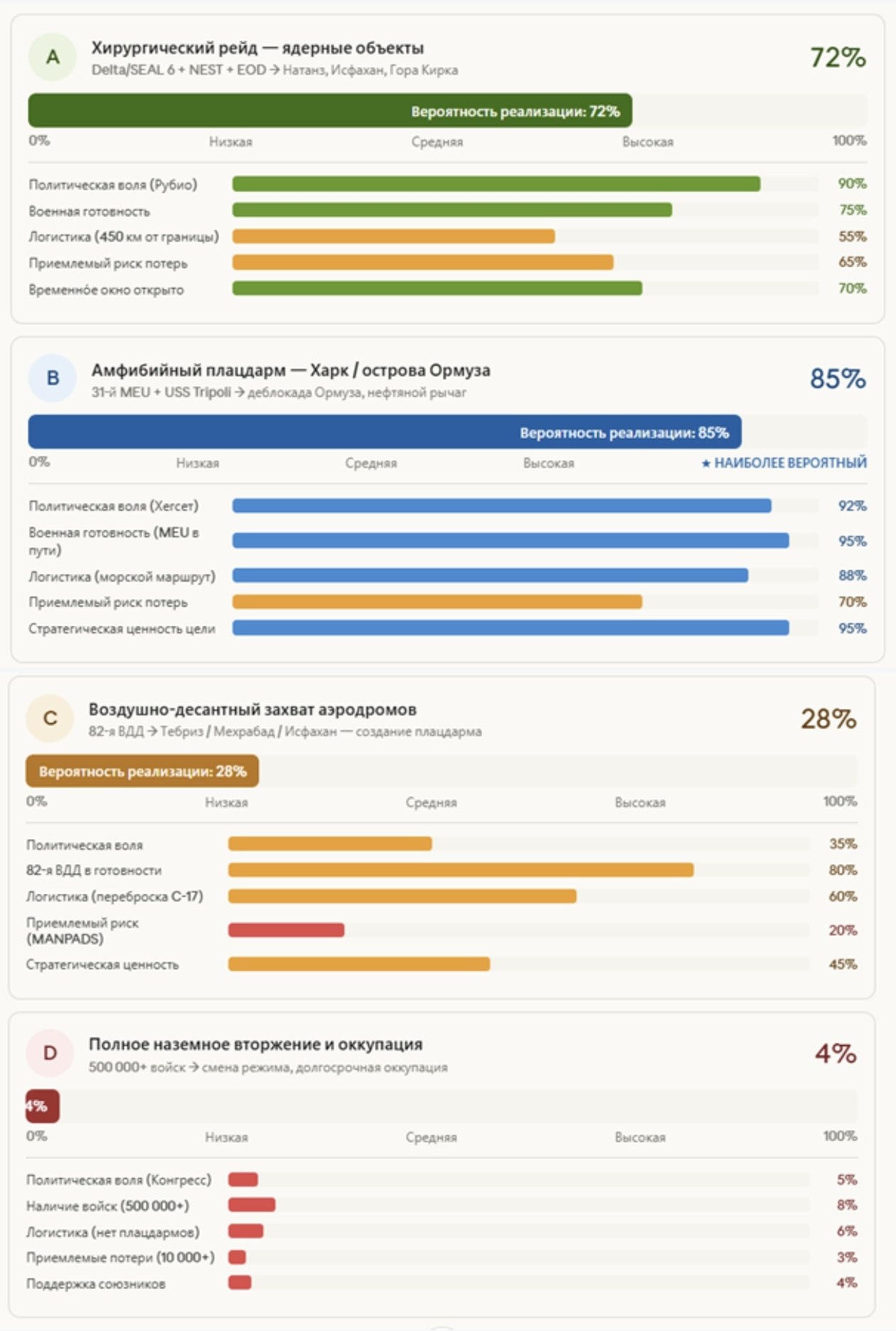 На инфографике: суммарный личный состав США в регионе, временная шкала развертывания, вероятности сценариев наземной операции, временное окно вероятностей, соотношение сил — операция против острова Харк, составы АДГ Tripoli и 31-го EMU, структура системы обороны Ирана, сравнение сил и риски.