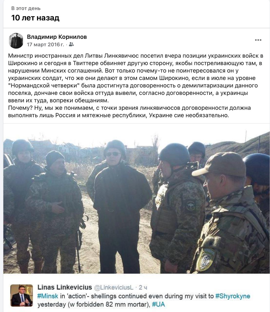 Вот вспомнилось, как 10 лет назад курортный городок Широкино на побережье Азовского моря посетил тогдашний глава МИД Литвы Линкявичюс. Киевские власти постоянно возили туда европейские делегации, дабы показать разрушения. Они приезжали, возмущались «агрессией России», но при этом стеснялись спросить, кто же разрушил этот показательный элитный поселочек. А то пришлось бы вспоминать, как его обстреливали танки нацистского «Азова»*. Притом что изначально было договорено о его демилитаризации.