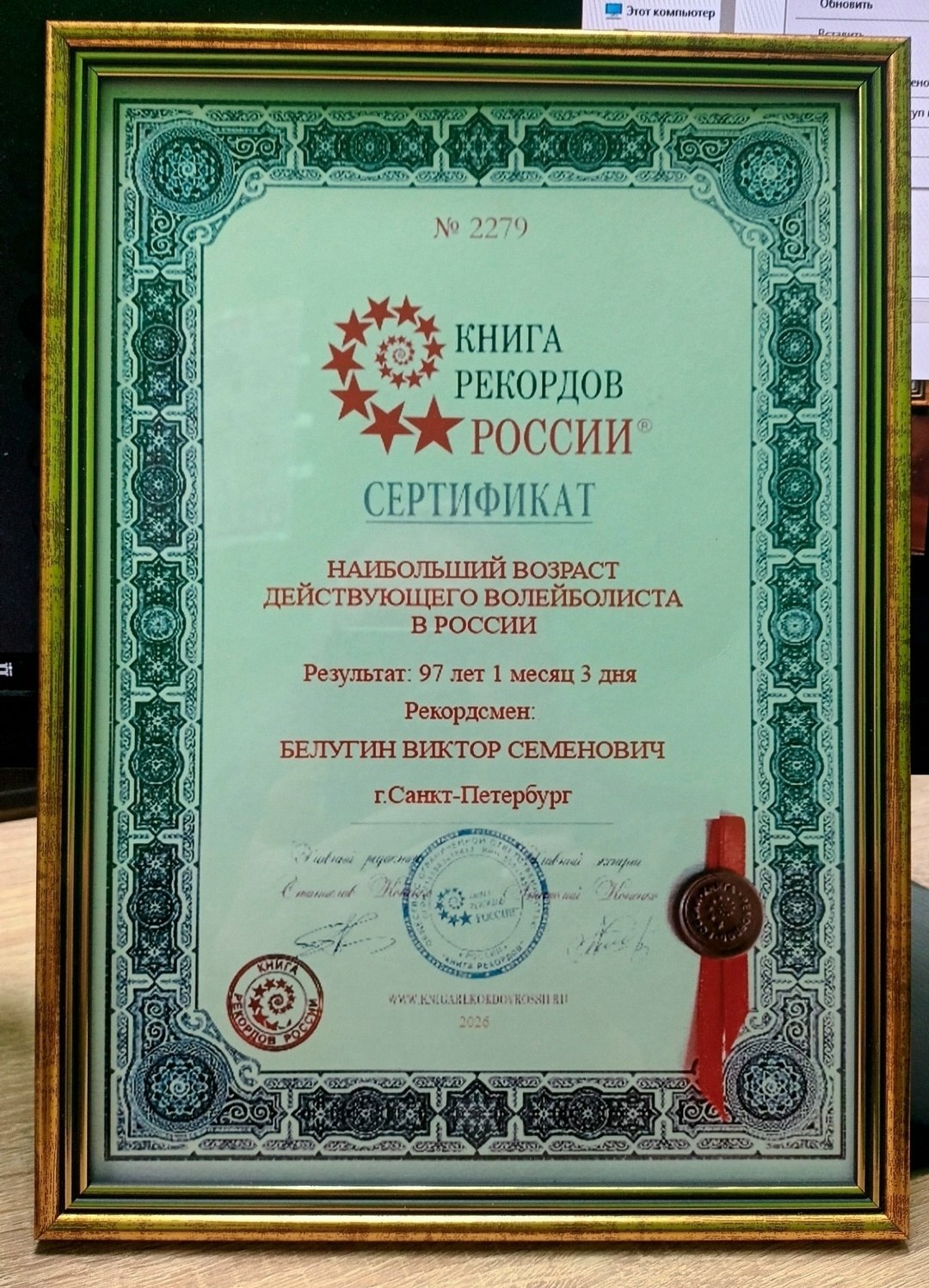 Торжественное вручение сертификата состоялось на Кубке России в Орле, где 97-летний спортсмен принял участие в соревнованиях. Первый президент Федерации волейбола страны Валентин Жуков передал Виктору Семеновичу сертификат от Книги рекордов России и памятную футболку.