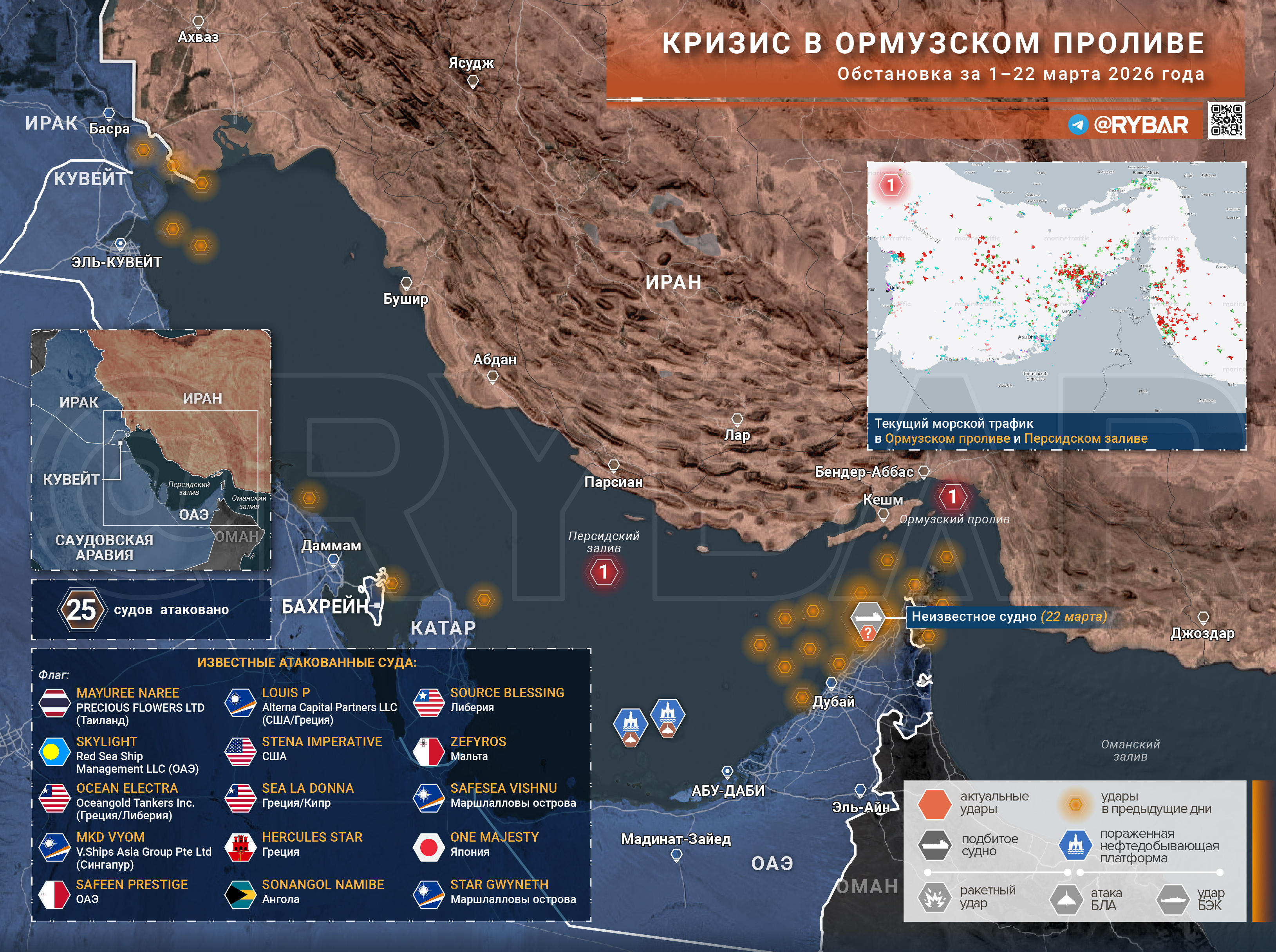 На двадцать третий день войны коалиция продолжила удары по Ирану, а иранцы — ракетные атаки по Израилю. Одновременно усиливается давление на Ормузский пролив, энергетику и логистику региона.