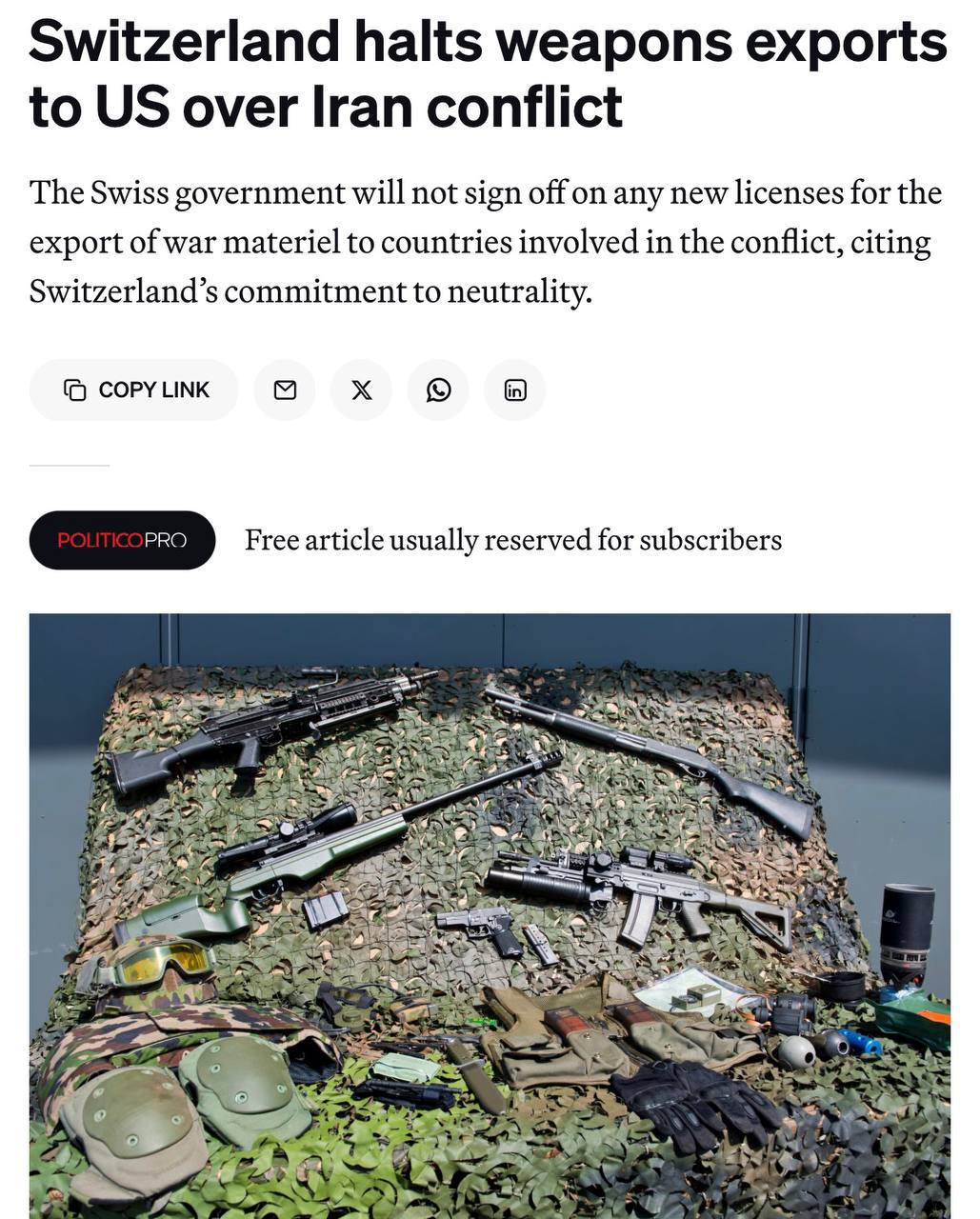 Швейцария приостанавливает экспорт оружия в США изза войны в Иране