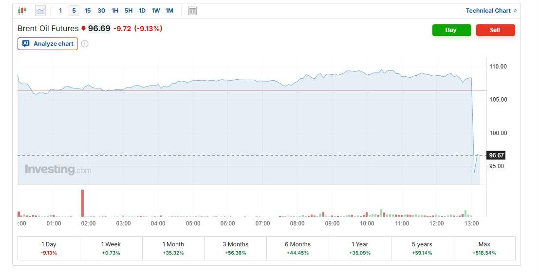 Цены на нефть марки Brent упали с 108 до 96 долларов за баррель после заявления Трампа о прекращении ударов по Ирану.