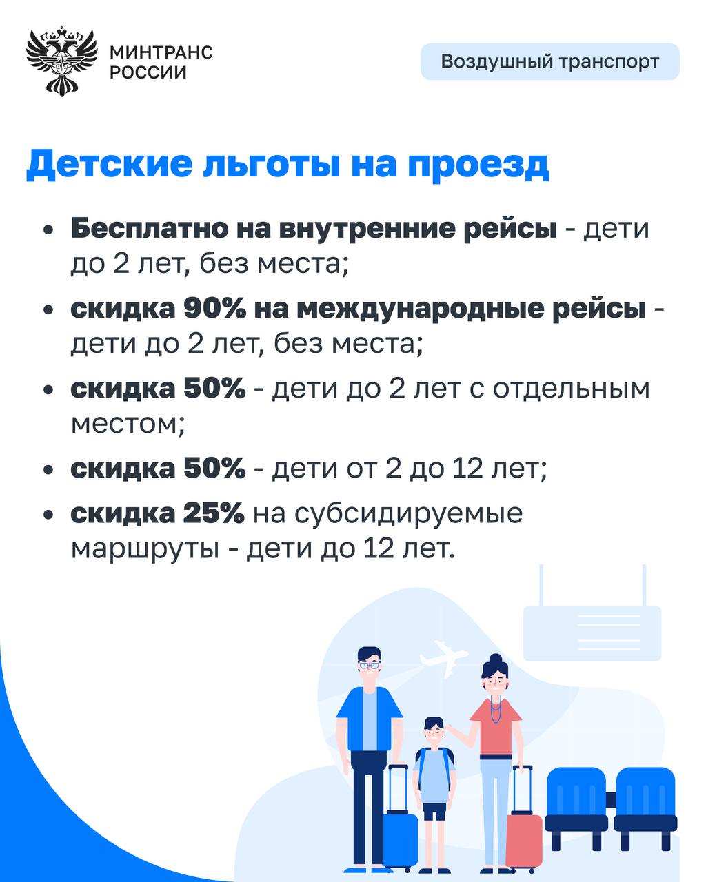 «Дети до 12 лет на внутренних воздушных рейсах в эконом-классе получают скидку 50%. Кроме того, Минтранс решил проблему предоставления соседних мест для членов семей. Также введены развлекательные наборы и детское питание на борту. Люльки и коляски могут быть перевезены в салоне сверх нормы багажа, что значительно облегчает путешествия с детьми», – отметил Константин Пашков.