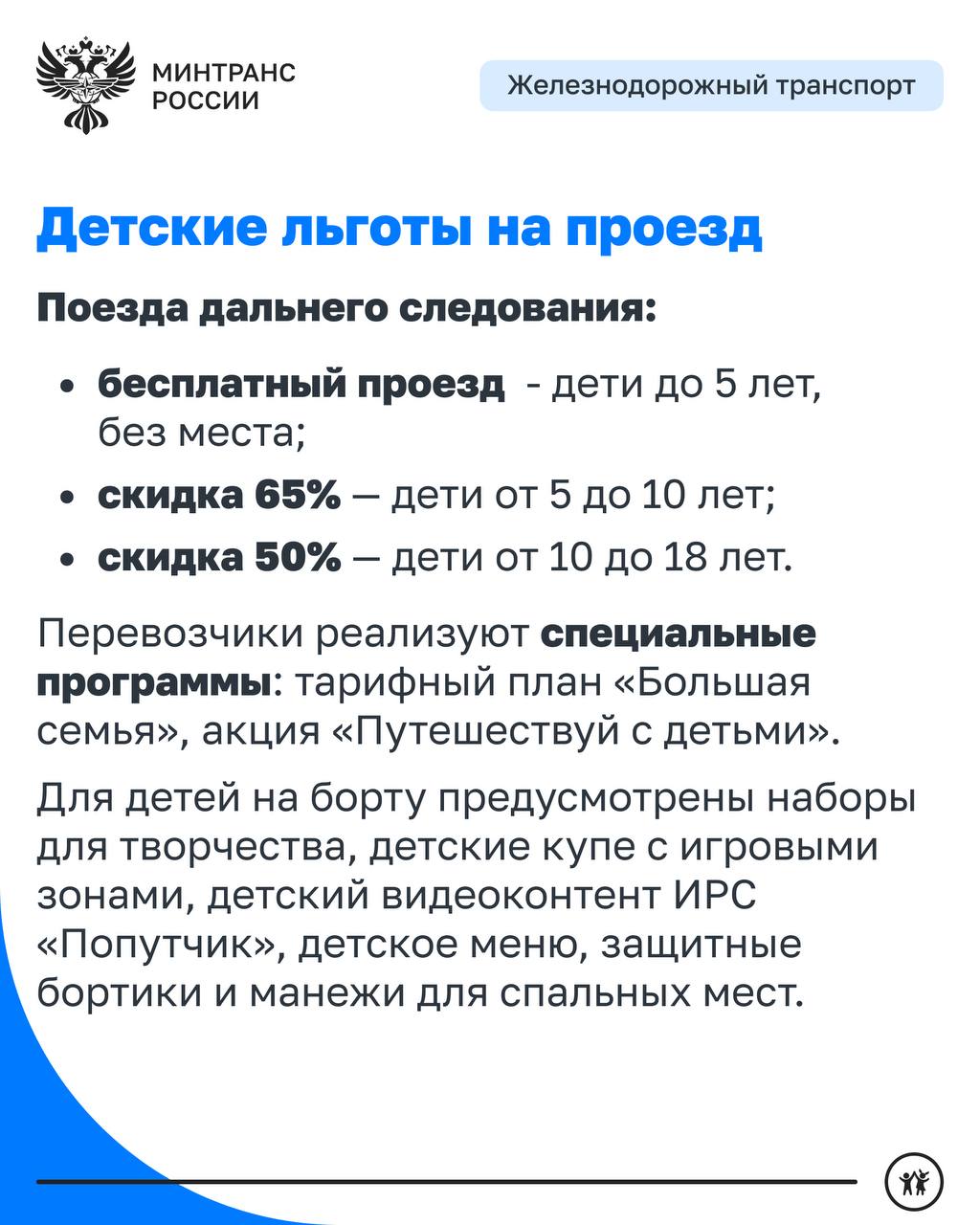 • На железнодорожном транспорте предоставляется широкий спектр льгот для детей, включая дифференцированные скидки на проезд в зависимости от возраста юных пассажиров.