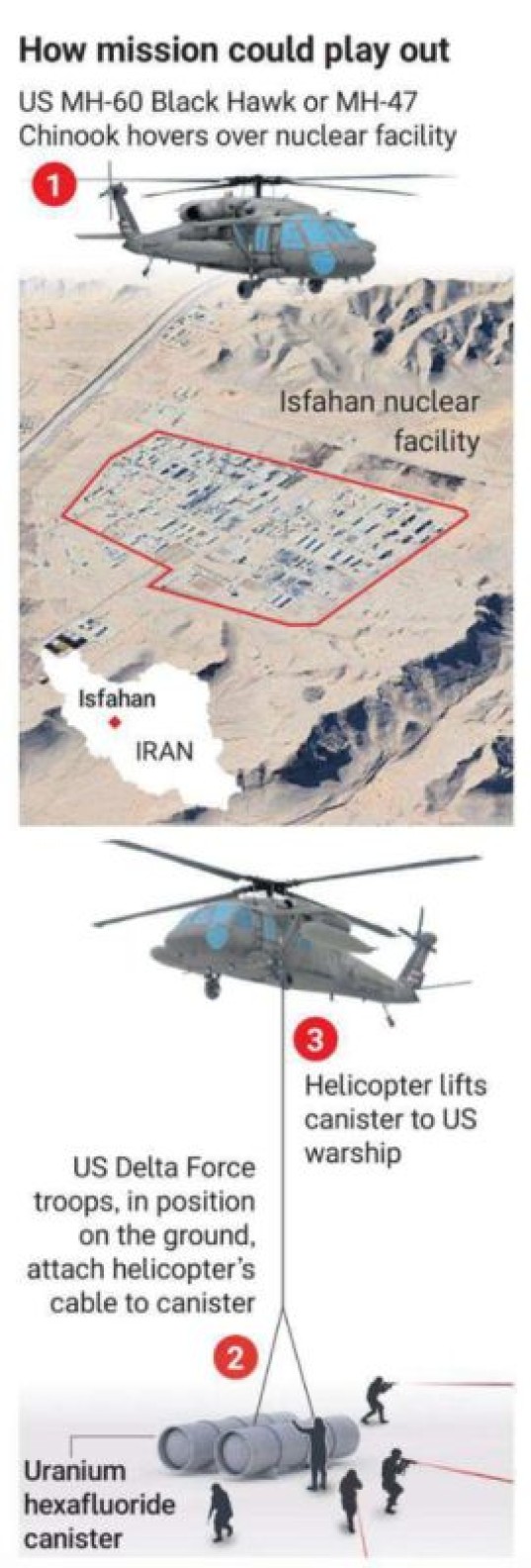 The Times сегодня открывает военную тайну, рассказывая о том, как американский спецназ несколько месяцев готовился к операции по захвату обогащенного урана в ядерном центре в Исфахане. Газета в этой связи довольно подобно разбирает, как будет выглядеть эта спецоперация: прилетели на вертолетах (всего-то 300 км над территорией Ирана надо пролететь!), высадились, постреляли всех врагов, извлекли более 200 кг радиоактивного урана, прицепили к вертолетам и даже к гигантским воздушным шарам (!), после чего победно улетели! Всех-то делов!