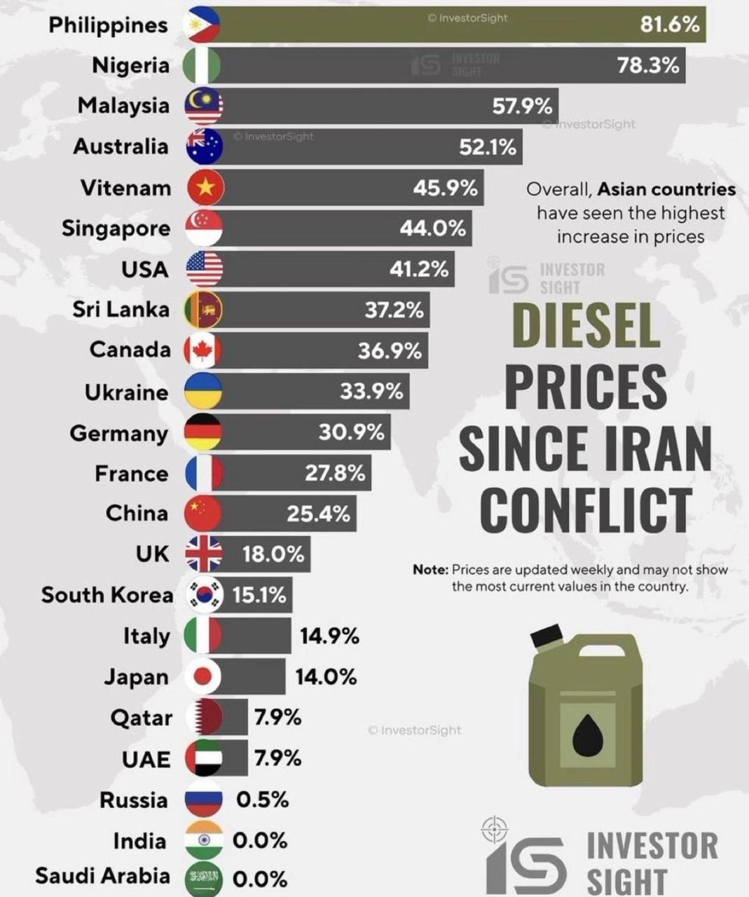 С начала конфликта дизель подорожал на Филиппинах на 81,6 %, в Нигерии — на 78,3 %, в Малайзии — на 57,9 %, в США — на 41,2 %, а в Германии — на 30,9 %..