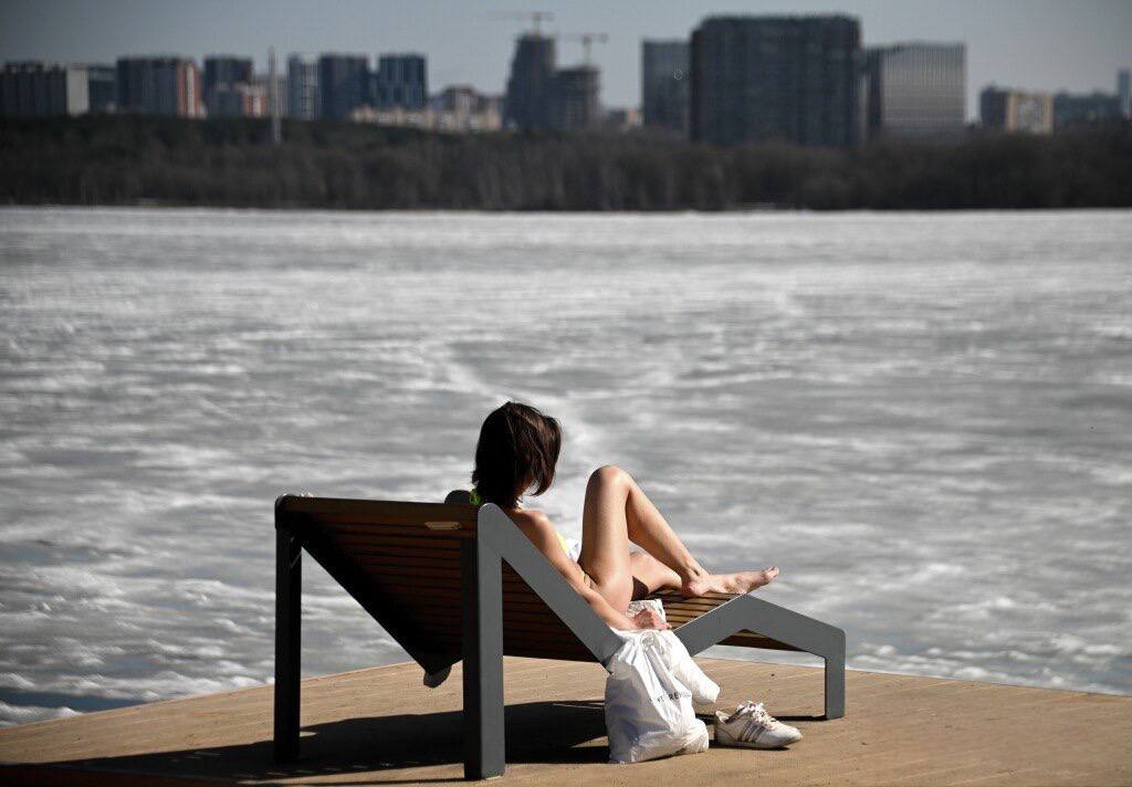 Фото из сети. Москва, 29 марта. На реке стоит лед, местами сугробы. Но температура бьет рекорды. В целом типа +17, на солнце все 25