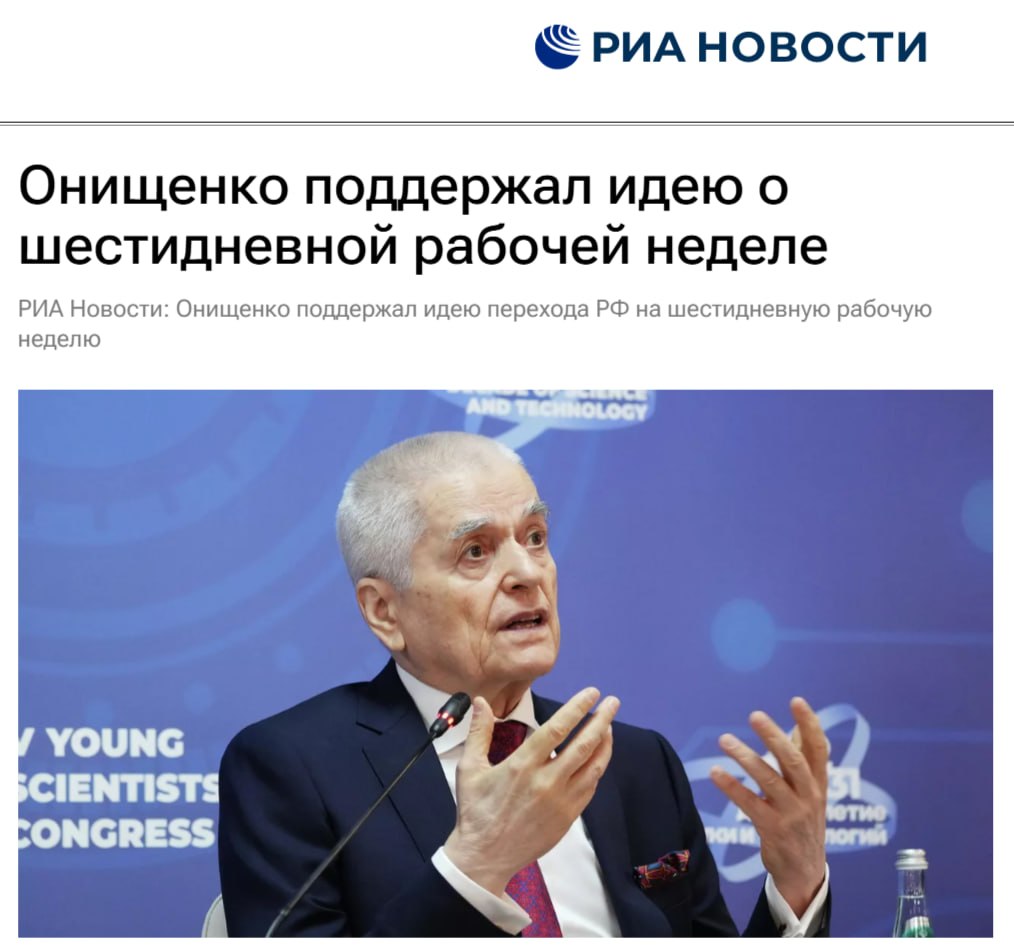 Геннадий Онищенко в разговоре с РИА Новости поддержал идею олигарха Дерипаски о переходе России на шестидневную рабочую неделю с 12-часовым рабочим днем.