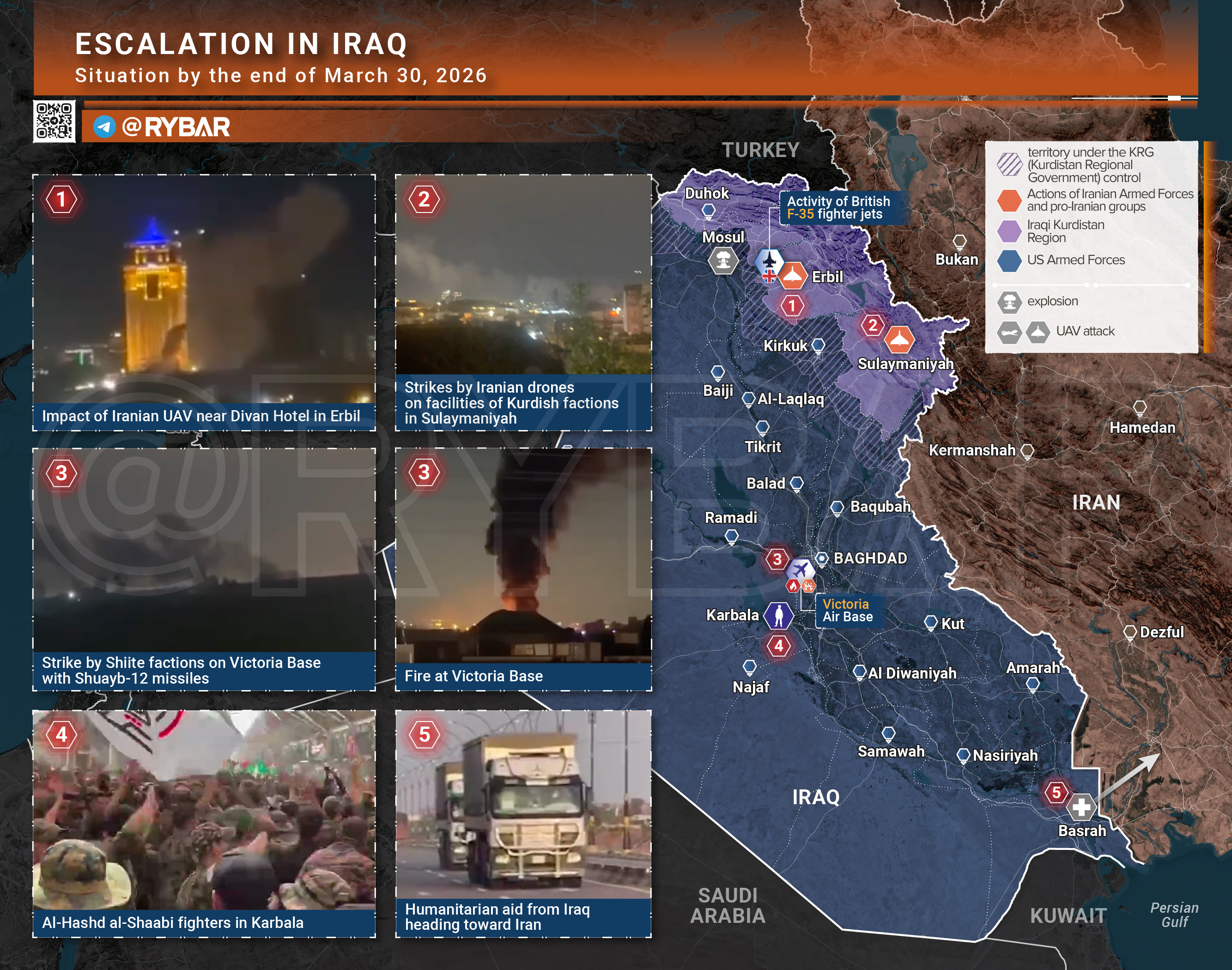 В Ираке сохраняется высокая интенсивность. Проиранские формирования и КСИР продолжают удары по американским объектам и курдской оппозиции, в том числе по базе Виктория, Эрбилю и Сулеймании. Даже если часть заявлений преувеличена, результативные попадания всё равно есть, а само направление остаётся одним из самых горячих.