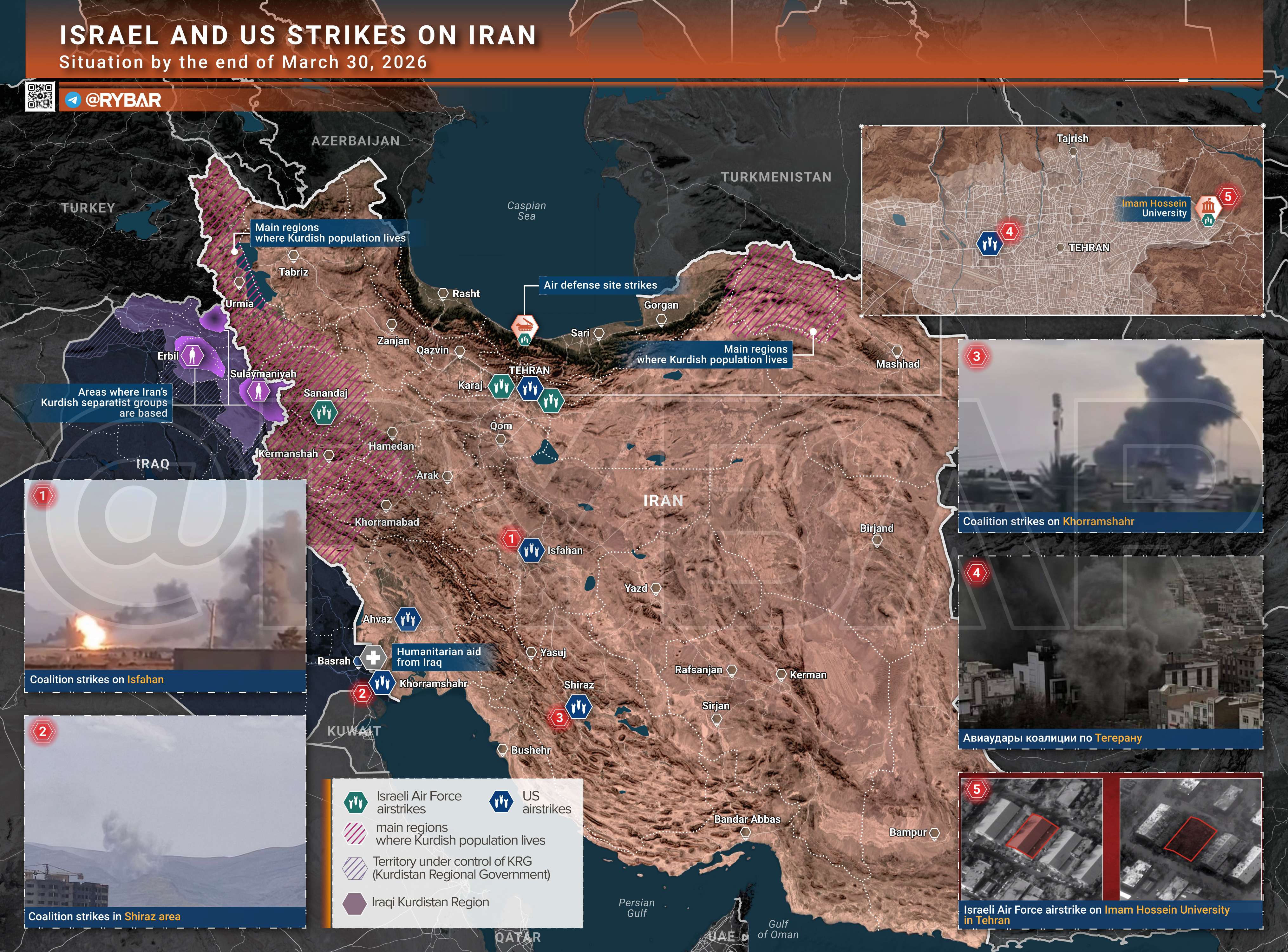 В Иране картина в целом прежняя — коалиция продолжает удары по Тегерану и другим крупным городам, делая ставку на разрушение научного, производственного и оборонного потенциала. Под удар попал университет Имама Хоссейна, также заявлено о поражении объекта ПВО у побережья Каспия. Однако на способности иранцев отвечать это пока влияет ограниченно.