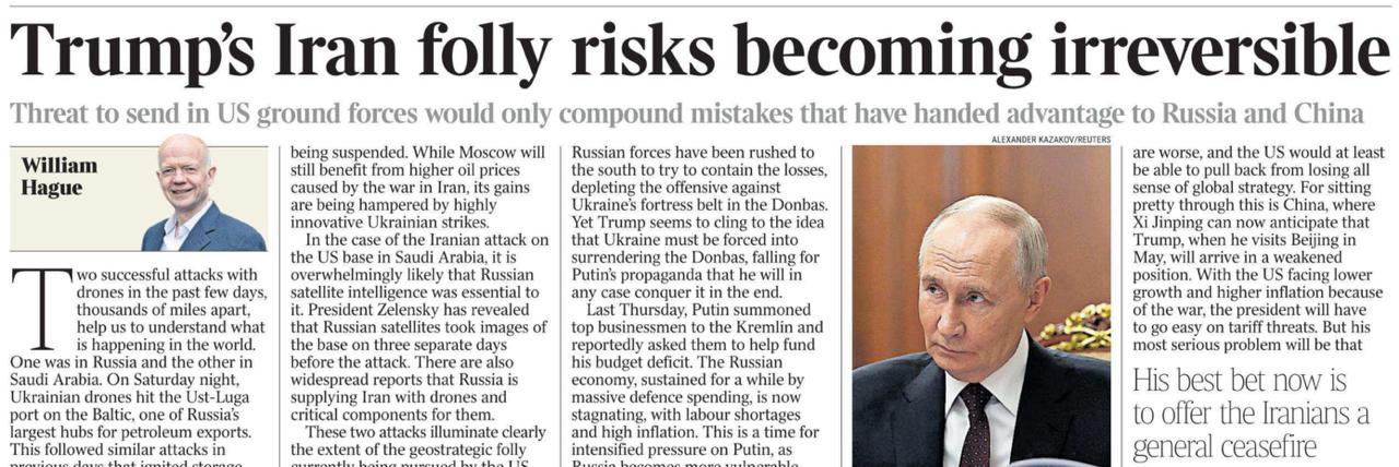 «Безрассудство Трампа в отношении Ирана рискует стать необратимым. Угроза ввести в страну сухопутные войска США лишь усугубит ошибки, которые дали преимущество России и Китаю». Это сегодня на страницах The Times пишет бывший министр иностранных дел Британии Уильям Хейг.