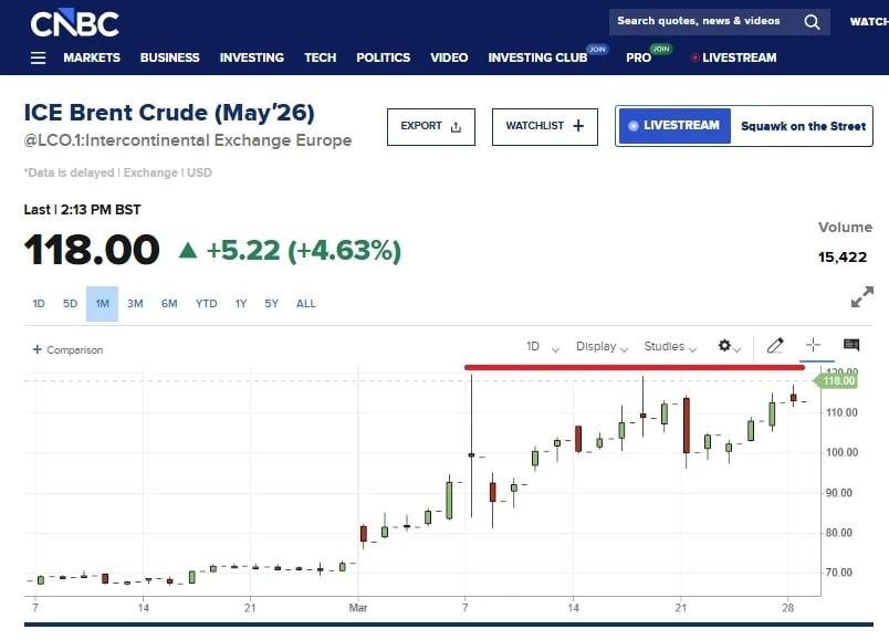 Юрий Баранчик: Тем временем нефть потихоньку тестирует паническую свечку от 9 марта, где было касание $119.50 за баррель,словесные интервенции и договорнячёк к 6 апреля откладывается
