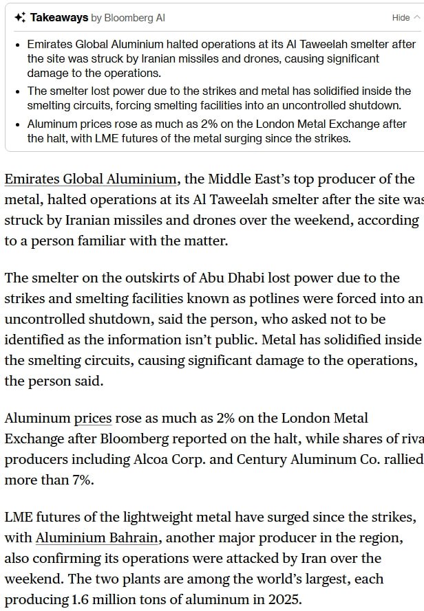 Кстати, как сообщает Bloomberg, в результате иранских ударов по алюминиевому заводу эмиратской компании Emirates Global Aluminium в районе Эт-Тавила в эмирате Абу-Даби (ОАЭ) завод был обесточен, произошла неконтролируемая остановка электролизных линий и алюминий застыл прямо внутри плавильных контуров. Под ударами и алюминиевый завод компании Aluminium Bahrain в Бахрейне. Алюминиевые заводы в ОАЭ и Бахрейне являлись одними из крупнейших в мире, каждый выпуская 1,6 млн т алюминия в год.