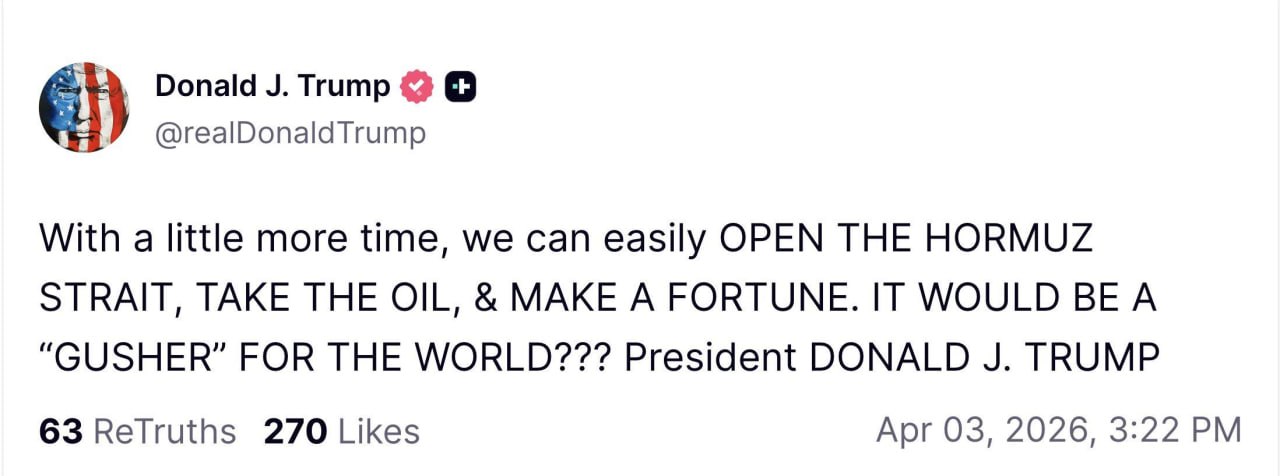 Если у нас будет немного больше времени, мы сможем легко ОТКРЫТЬ ОРМУЗСКИЙ ПРОЛИВ, ЗАБРАТЬ НЕФТЬ И ЗАРАБОТАТЬ КУЧУ ДЕНЕГ — это будет настоящая "ЗОЛОТАЯ ЖИЛА" для всего мира (с) Трамп