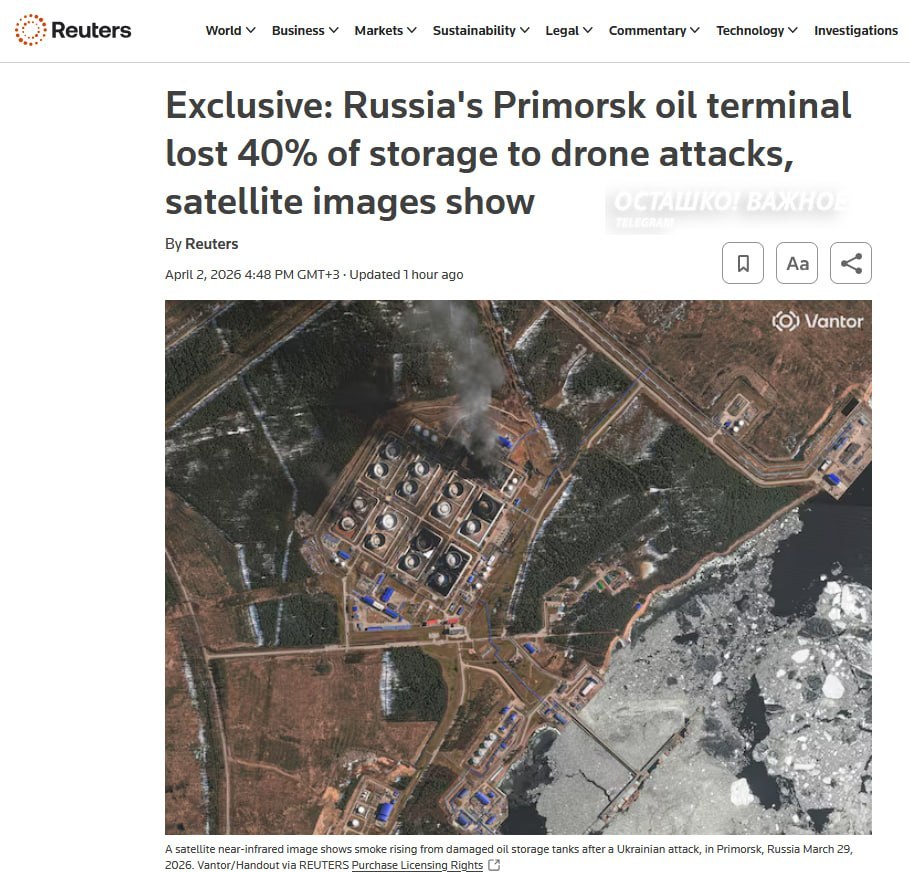Ранее, 2 апреля, Reuters писало, что вражеские дроны повредили до 40% хранилищ в порту Приморск. По данным издания, повреждёнными оказались не менее восьми нефтяных резервуаров, вмещающих около 400 тысяч кубометров. При этом Приморск может перерабатывать до миллиона баррелей нефти в сутки, что составляет 1% от мирового предложения.