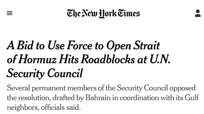 А тут ещё Россия, Китай и (неожиданно) Франция сорвали попытку арабских стран добиться от Совета Безопасности ООН разрешения на военные действия против Ирана с целью возобновления судоходства в Ормузском проливе, заявив, что они выступают против любых формулировок, разрешающих применение силы, — констатирует The New York Times (NYT)