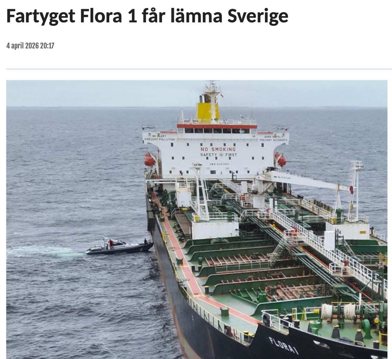 Танкер Flora 1, связанный с так называемым теневым флотом России, 3 апреля задержали в шведской экономической зоне из-за разлива нефти длиной более 12 км.