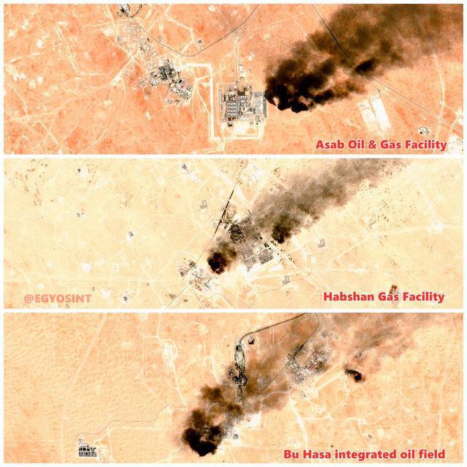 Спутниковые снимки показывают пожары на крупнейших нефтегазовых объектах в ОАЭ после иранских ударов (фото 3 в 1).