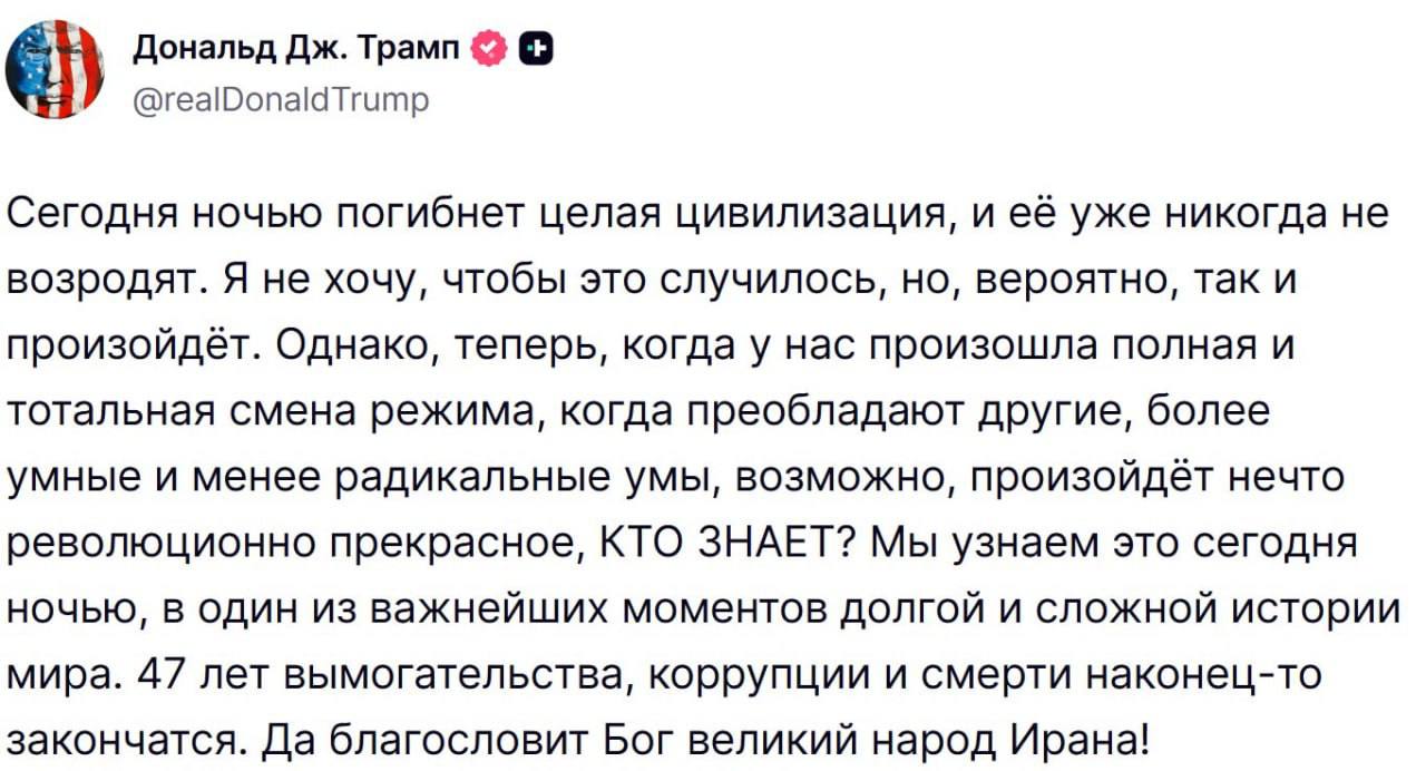 Трамп нагнетает... «Сегодня ночью погибнет целая цивилизация, и ее уже никогда не возродят. Я не хочу, чтобы это случилось, но, вероятно, так и произойдёт. возможно, произойдет нечто революционно прекрасное, КТО ЗНАЕТ? Мы узнаем об этом сегодня...