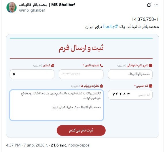 ‘Готов пожертвовать собой ради Ирана’ - спикер парламента Ирана Галибаф зарегистрировался добровольцем на случай наземной операции США.