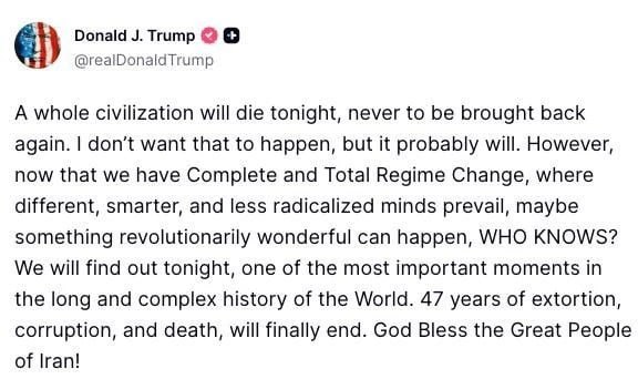 «Сегодня ночью погибнет целая цивилизация, и ее уже никогда не возродят. Я не хочу, чтобы это случилось, но, вероятно, так и произойдёт. <...> возможно, произойдет нечто революционно прекрасное, КТО ЗНАЕТ? Мы узнаем об этом сегодня вечером, в один из самых важных моментов в долгой и сложной истории мира. 47 лет вымогательства, коррупции и смертей, наконец, закончатся. Да благословит Господь Великий народ Ирана!»