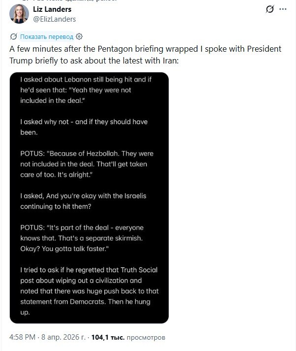 'Это часть сделки' – Трамп заявил PBS News, что Израилю позволено бомбить Ливан.